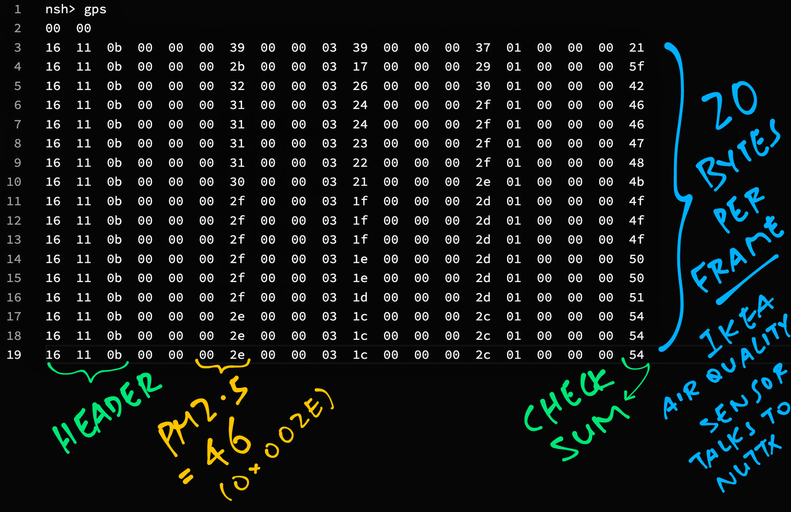 Apache #NuttX OS shows the UART Data from IKEA Air Quality Sensor! Let's dump the data in hex