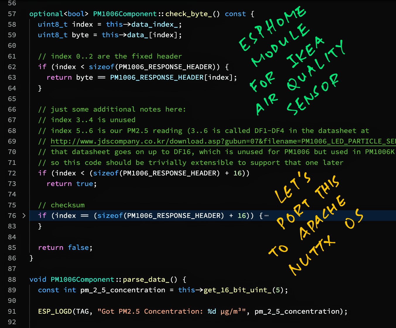 ESPHome has a module that parses the data from IKEA Air Quality Sensor ... Let's port it to Apache #NuttX OS