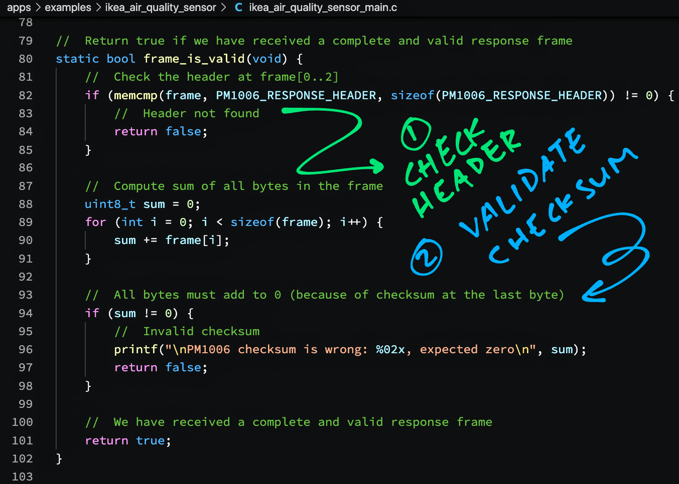 Our #NuttX App validates the Sensor Data received from IKEA Air Quality Sensor ... By matching the header and verifying the checksum