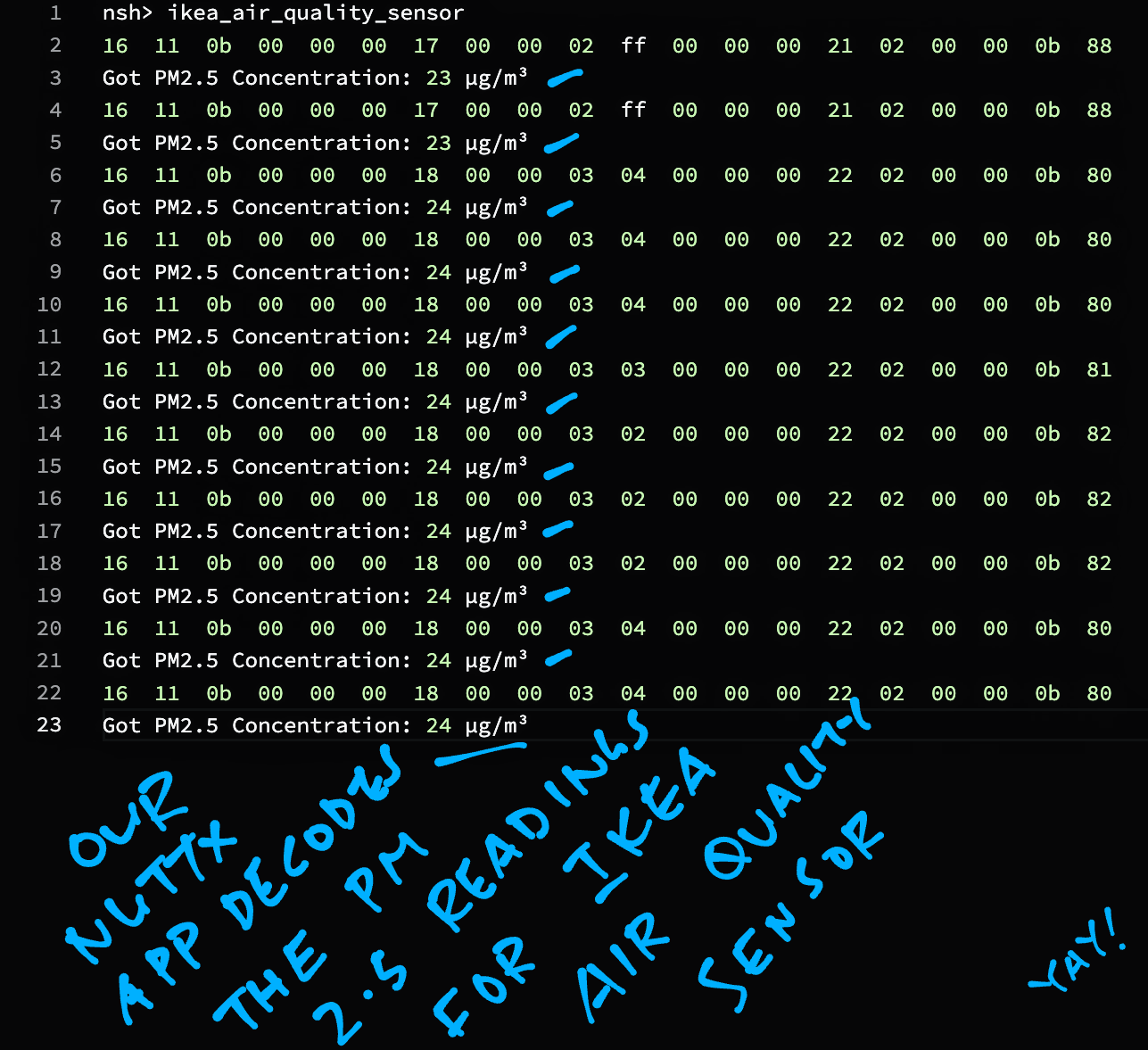 #NuttX OS shows Sensor Data received from IKEA Air Quality Sensor ... With PM 2.5 encoded inside!