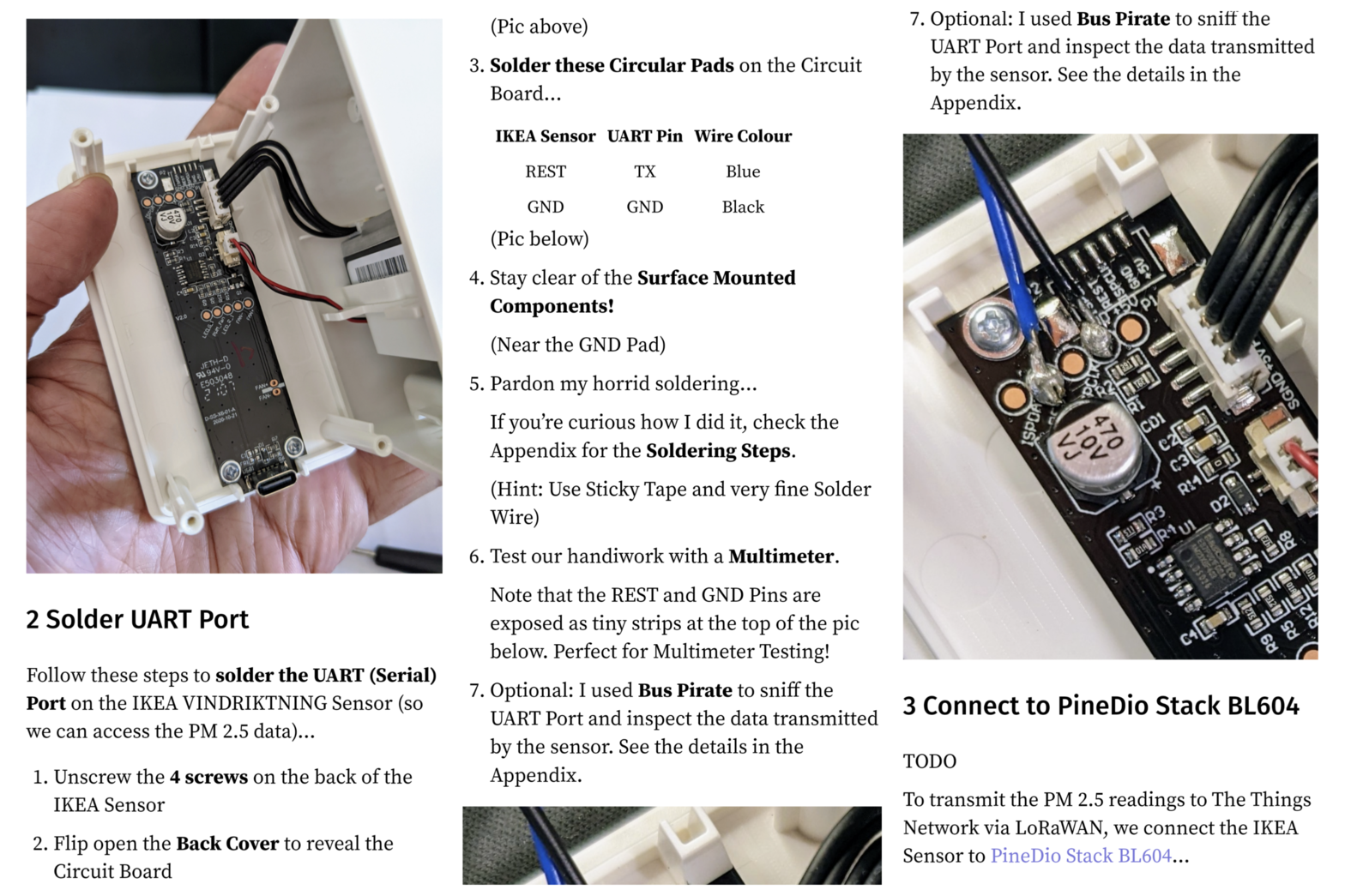 Now we connect IKEA Air Quality Sensor to #PineDio Stack #BL604 @PINE64 ... So we can transmit PM 2.5 readings over LoRaWAN to The Things Network!