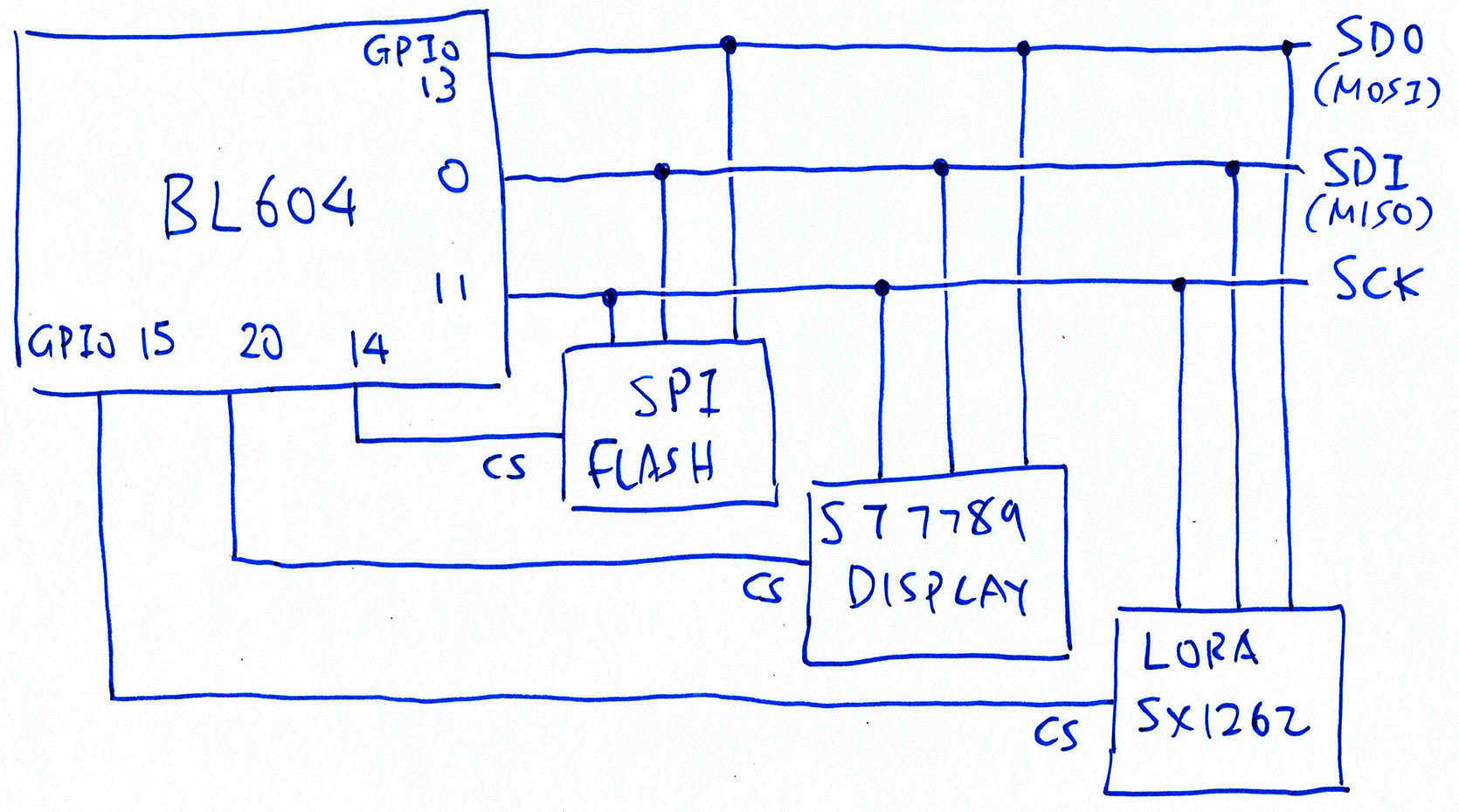 SPI Bus on #PineDio Stack #BL604 is wired to 3 devices: 1️⃣ ST7789 Display 2️⃣ LoRa SX1262 3️⃣ SPI Flash ... Each with its own Chip Select Pin ... Let's tweak #NuttX RTOS to support this