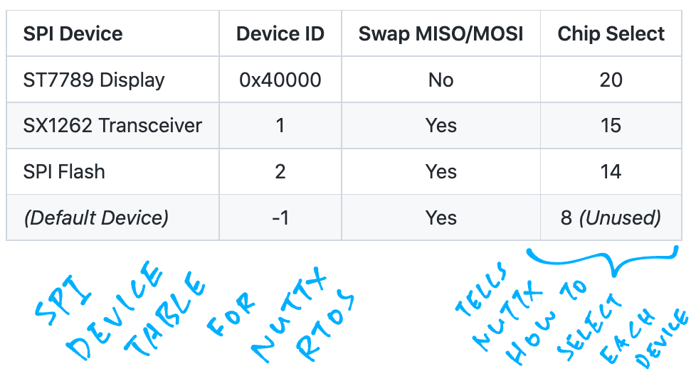 We create an SPI Device Table in #NuttX that defines each device wired to the SPI Bus ... NuttX SPI Driver will use this table to control the SPI Bus