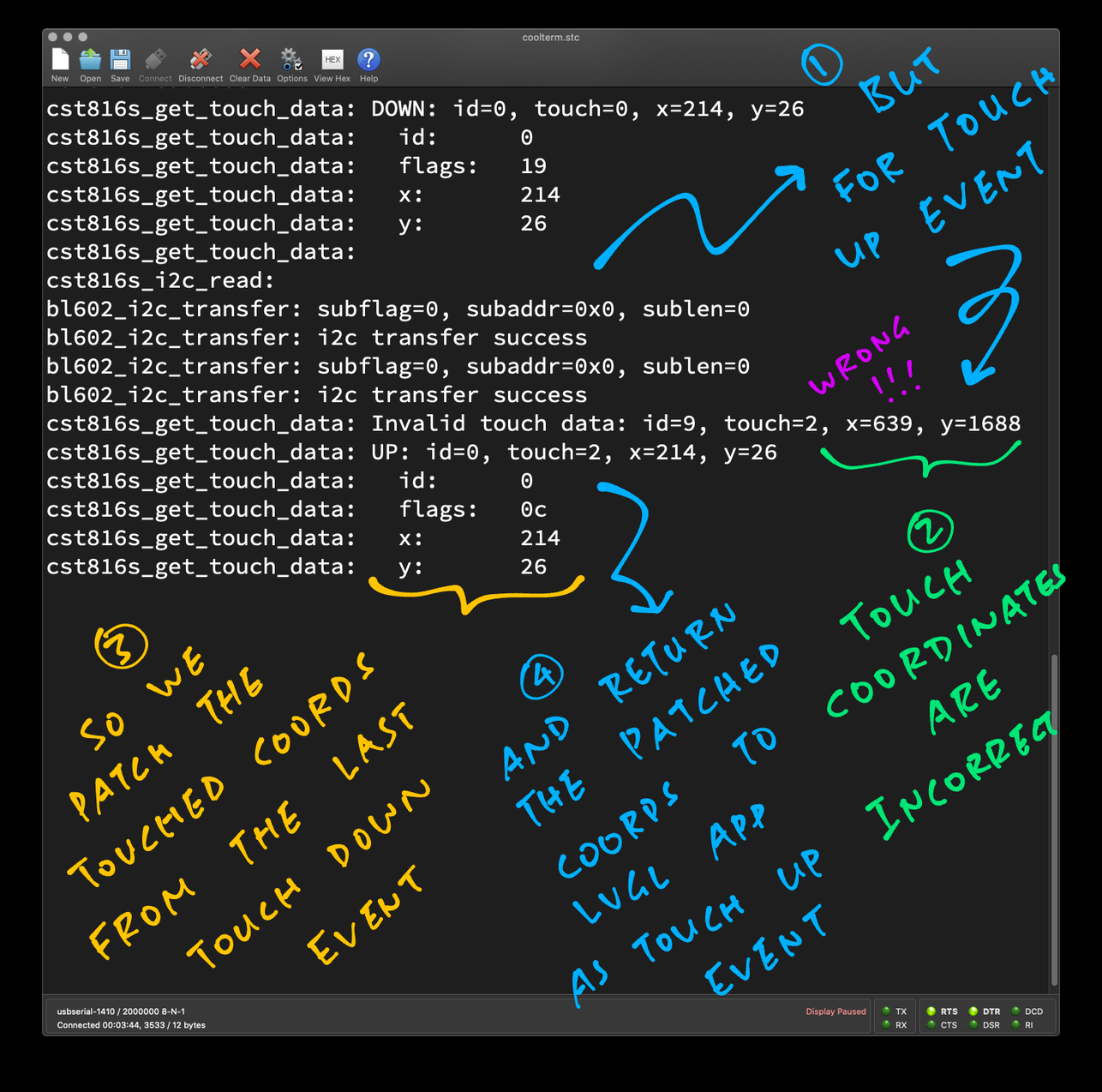 But for Touch Up Events the Touch Coordinates are invalid ... Our #PineDio Stack driver patches the Touch Coordinates with the data from the last Touch Down Event