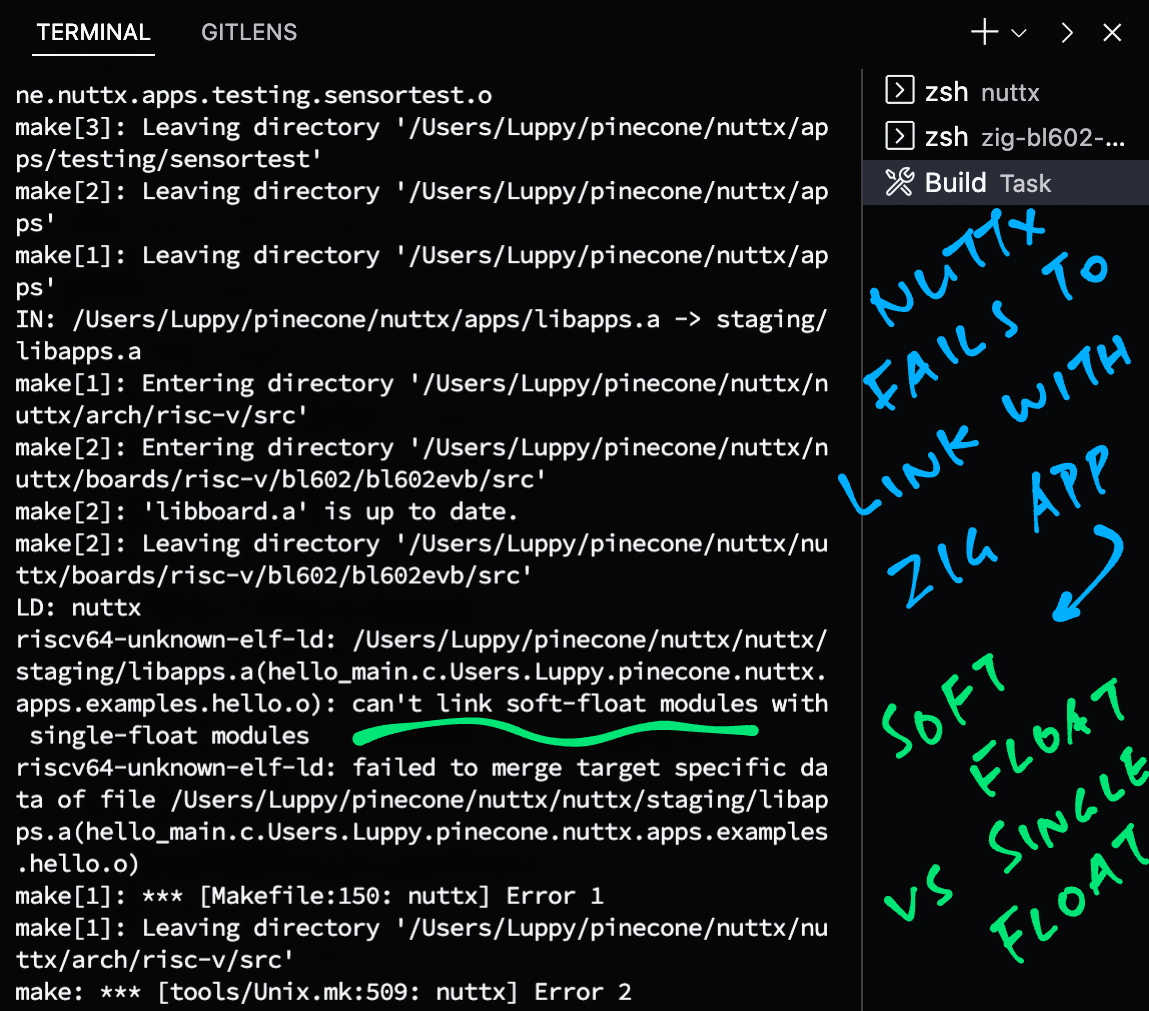 Apache #NuttX RTOS fails to link with our #ZigLang Compiled App ... Let's find out why we "can't link soft-float modules with single-float modules"