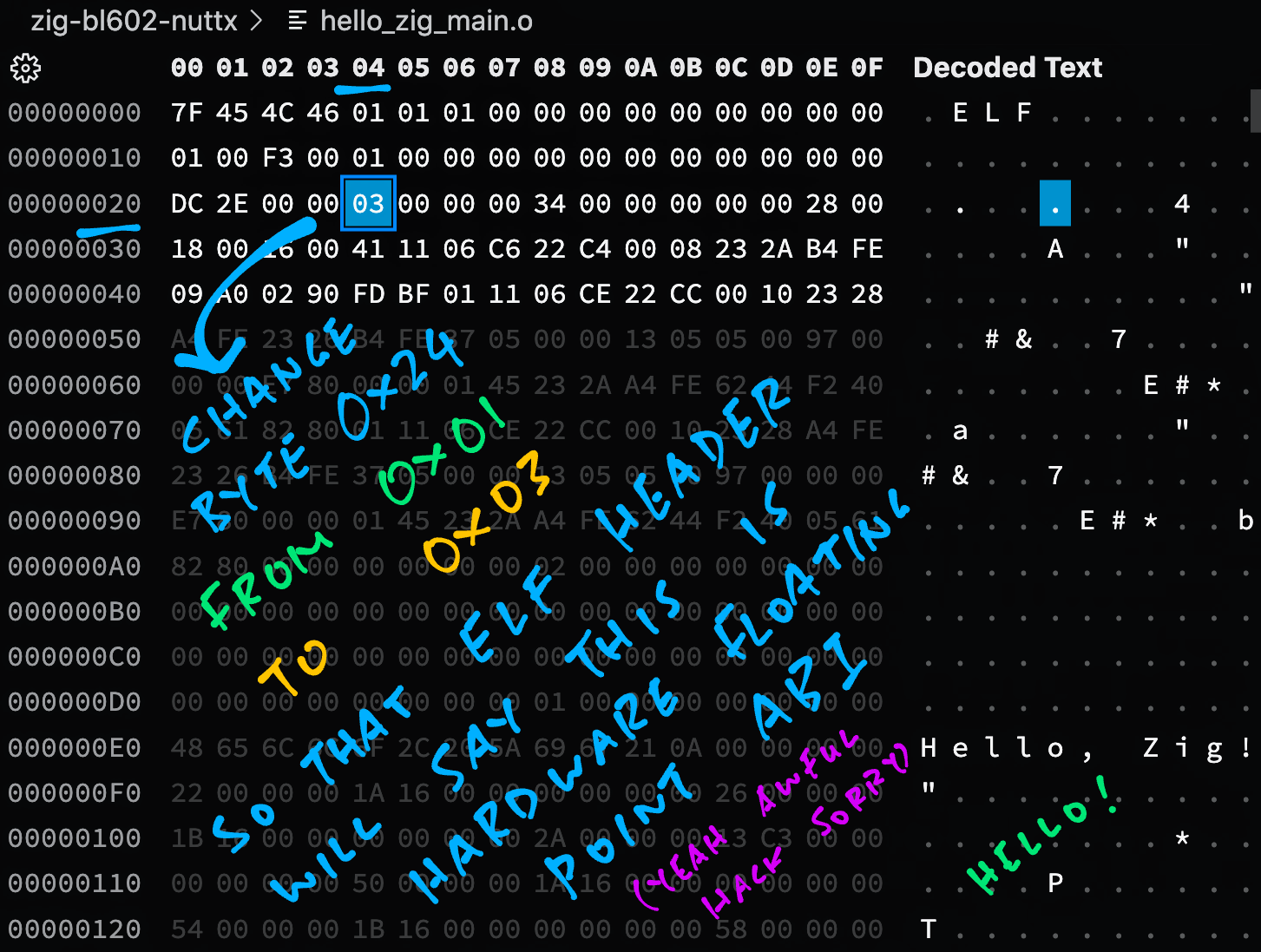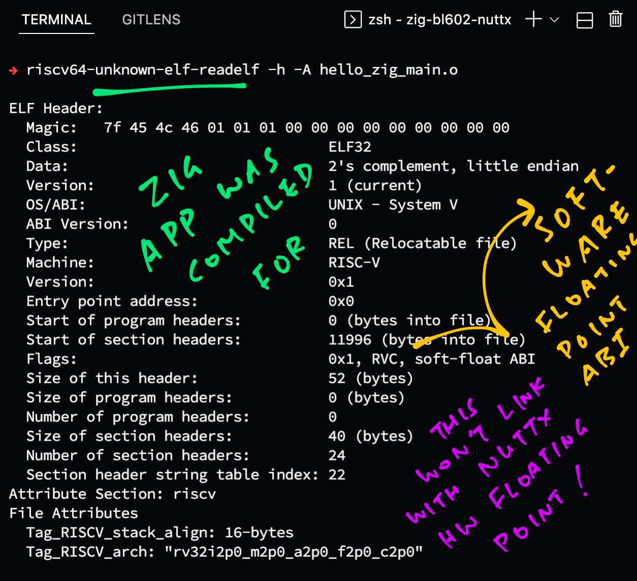 But #ZigLang Compiler produces an Object File with Software Floating-Point ABI ... This won't link with #BL602 #NuttX on Hardware Floating-Point!
