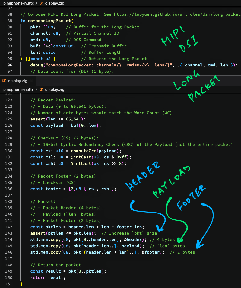 Our #ZigLang Display Driver for #PinePhone composes a MIPI DSI Long Packet