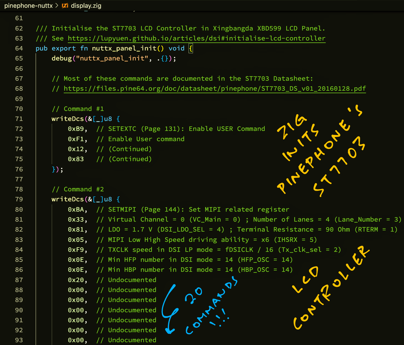 #PinePhone's ST7703 LCD Controller needs to be initialised with these 20 Commands ... Let's send them with our #NuttX Driver in #ZigLang
