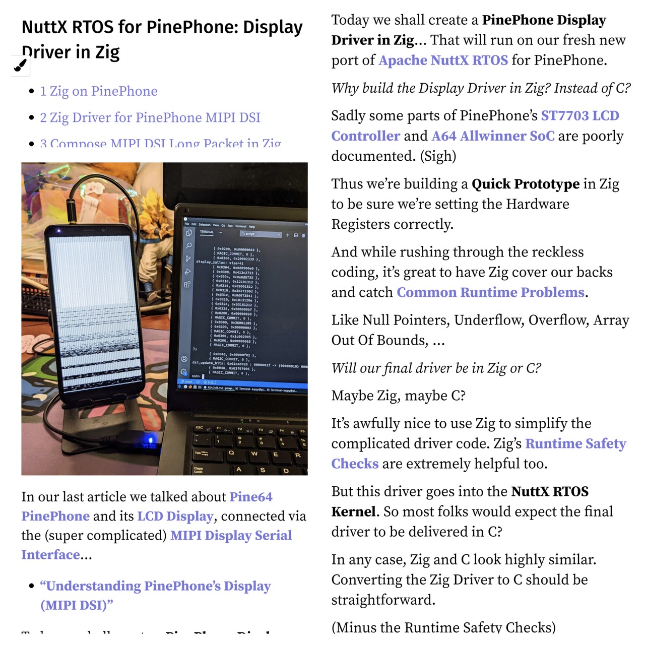 @tunamac I chose Zig to build my PinePhone Display Driver because Zig is very similar to C, and it does helpful runtime checks: Null Pointers, Underflow, Overflow, Array out of bounds