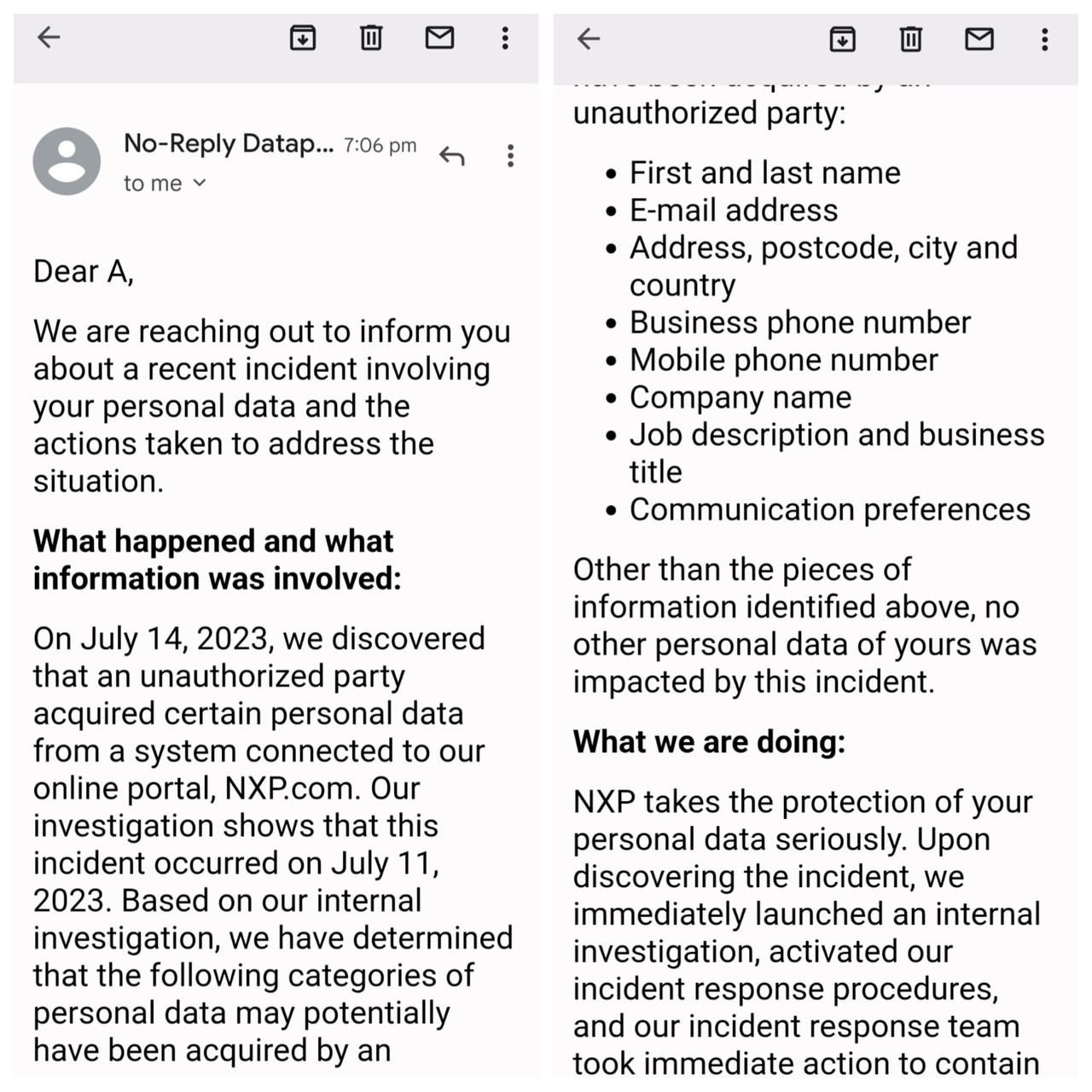 🙄 "an unauthorized party acquired certain Personal Data from a system connected to our online portal, #NXP .com"