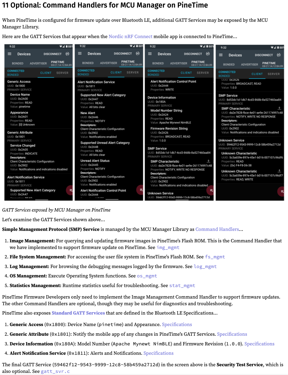Useful #BluetoothLE GATT Services exposed by #PineTime Smart Watch @PINE64 ... Thanks to the open source MCU Manager Library for @Apache_Mynewt and @ZephyrIoT https://lupyuen.github.io/pinetime-rust-mynewt/articles/dfu