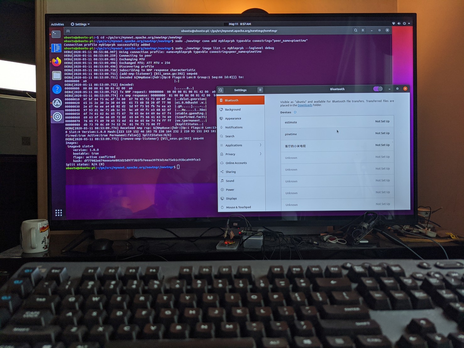 @Raspberry_Pi 4 with 64-bit @Ubuntu Desktop... Querying the firmware installed on #PineTime Smart Watch @PINE64 over Bluetooth LE... Had to plug in a USB Bluetooth dongle though https://lupyuen.github.io/pinetime-rust-mynewt/articles/dfu