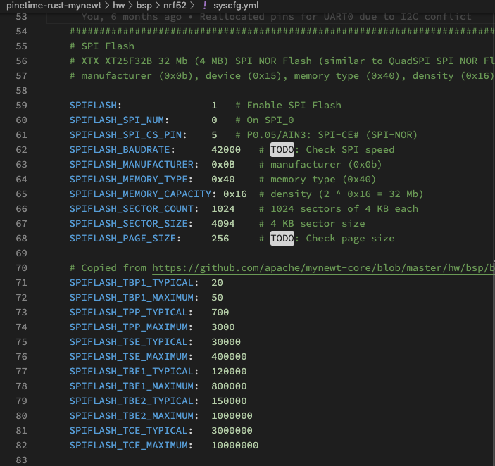 SPI Flash settings @Apache_Mynewt for #PineTime Smart Watch @PINE64 ... Does this look right 🤔 https://github.com/lupyuen/pinetime-rust-mynewt/blob/ota2/hw/bsp/nrf52/syscfg.yml