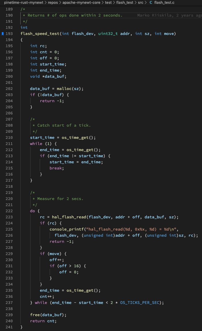 Testing Flash Memory speed with @Apache_Mynewt... For Internal Flash ROM and External SPI Flash on #PineTime Smart Watch @PINE64 https://github.com/apache/mynewt-core/blob/master/test/flash_test/src/flash_test.c