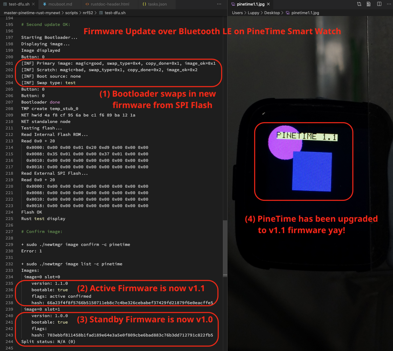 Happy to report that #PineTime Smart Watch @PINE64 hasn't bricked yet... While swapping 3 Wireless Firmware Updates again and again... Thanks to the open source #MCUBoot Bootloader from @Apache_Mynewt and @ZephyrIoT! https://lupyuen.github.io/pinetime-rust-mynewt/articles/dfutest