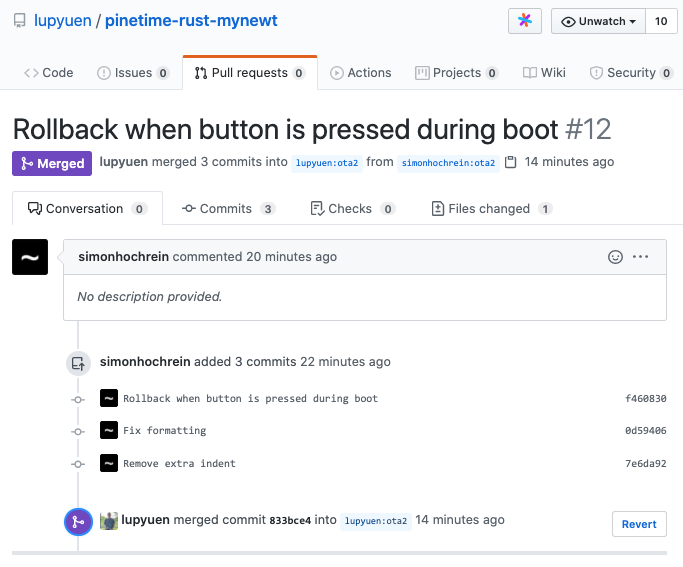 What happens when you press and hold #PineTime's button during startup? PineTime Smart Watch rolls back the firmware to the previous version! Thanks to the PineTime FOSS Community @PINE64 for making #MCUBoot Bootloader better yay! https://github.com/lupyuen/pinetime-rust-mynewt/pull/12