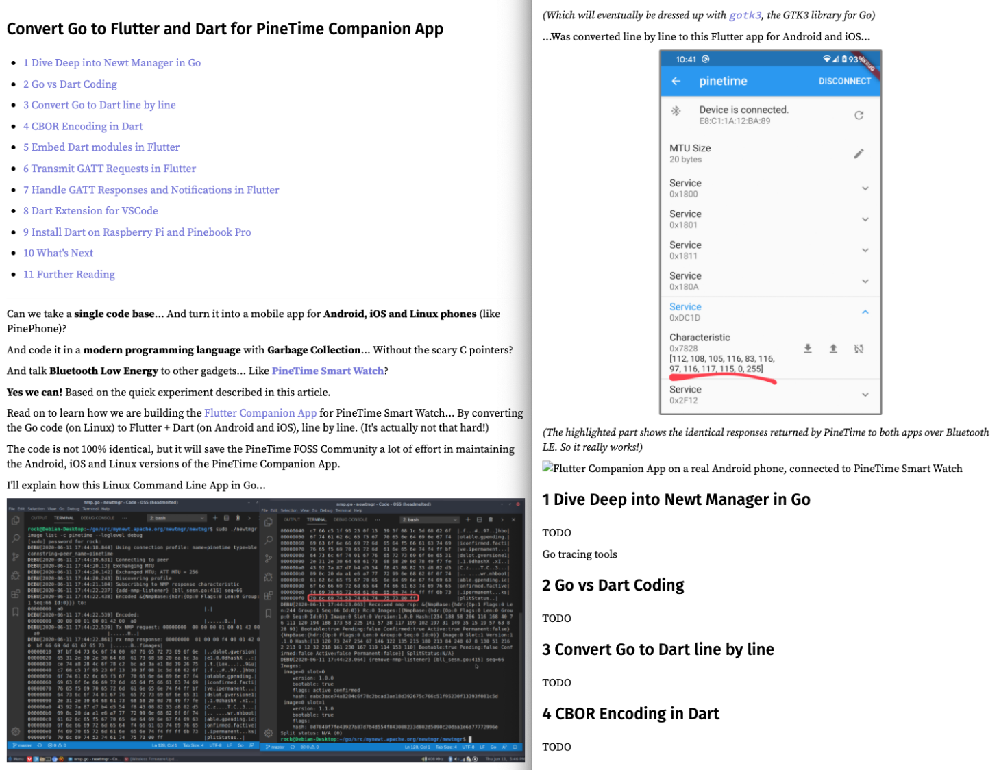 A Single Code Base for Android, iOS and Linux mobile apps... I'll explain how we're building the #BluetoothLE Companion App for #PineTime Smart Watch @PINE64 ... With #GoLang, #DartLang and #Flutter! https://lupyuen.github.io/pinetime-rust-mynewt/articles/companion