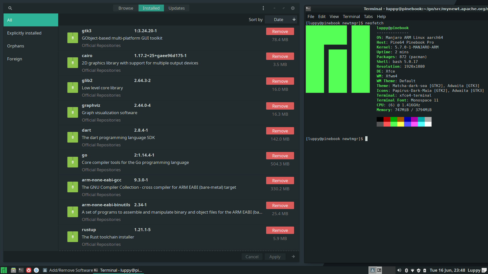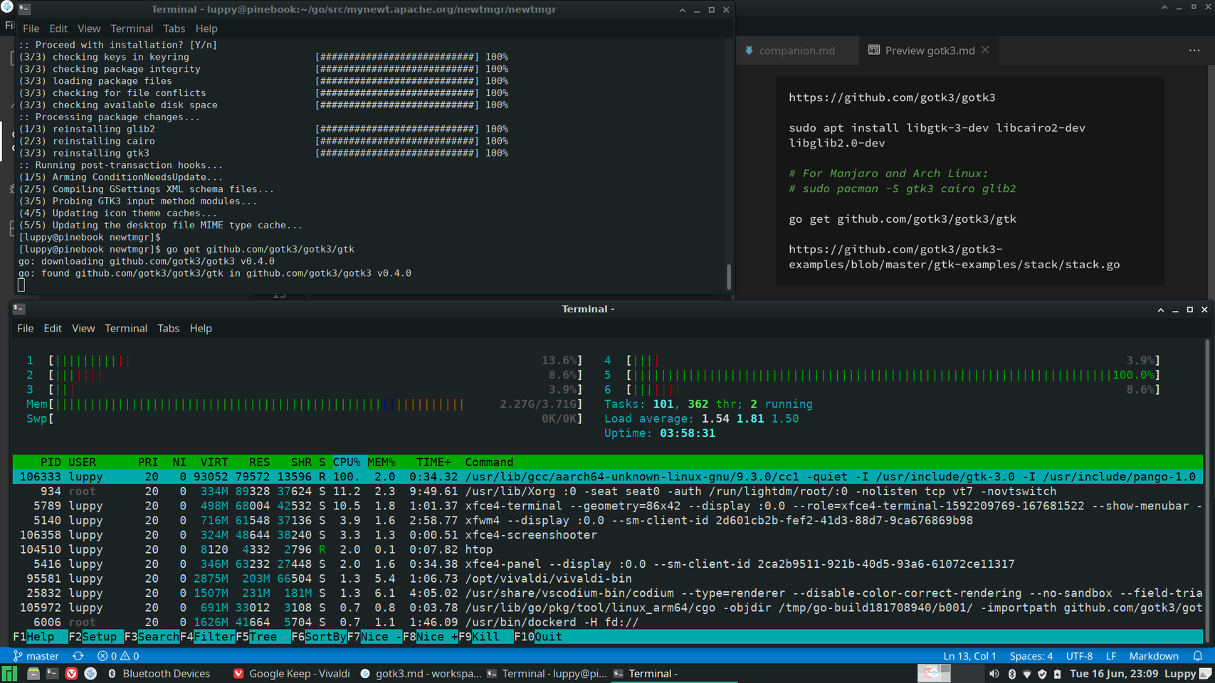 Stress-Testing 64-bit Manjaro Xfce on #Pinebook Pro @PINE64 with "go get github.com/gotk3/gotk3/gtk"... And getting ready to build #PinePhone apps with #GTK3 on #GoLang!