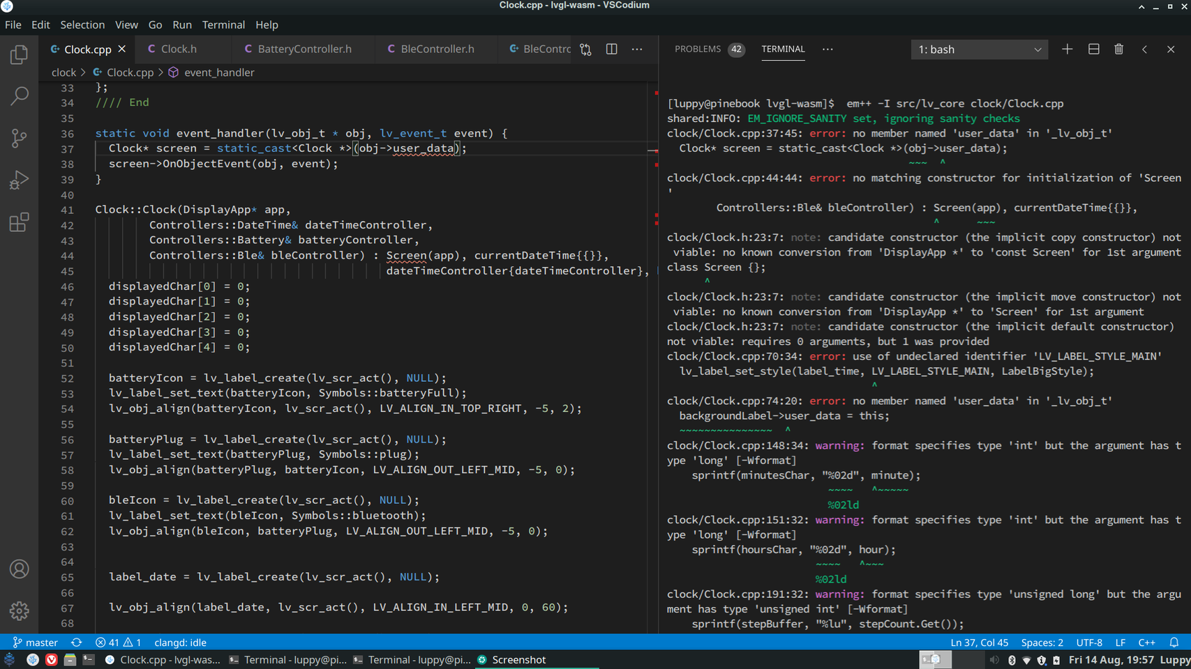 Compiling actual #PineTime Watch Face @PINE64 ... From C++ to #WebAssembly... Only 4 errors left to fix! https://github.com/AppKaki/lvgl-wasm/blob/master/clock/Clock.cpp