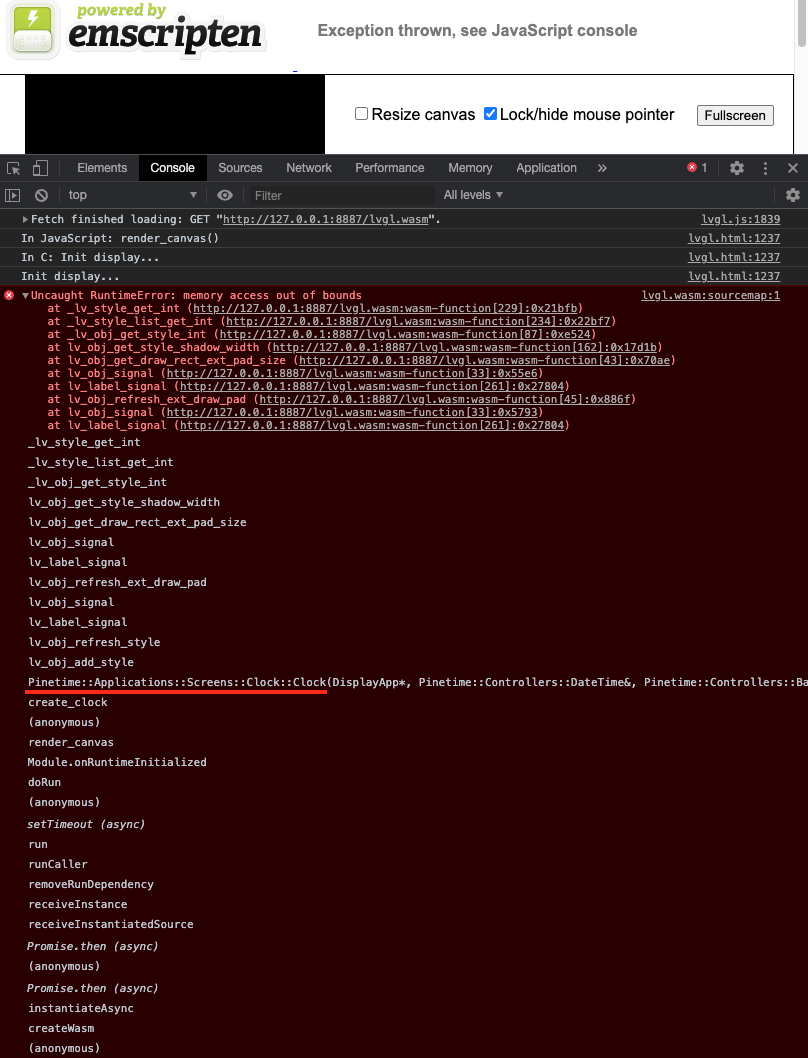Our First #WebAssembly Stack Trace... Triggered by the #PineTime Watch Face compiled from C++ #LVGL to WebAssembly... So cool! https://github.com/AppKaki/lvgl-wasm/blob/master/README.md