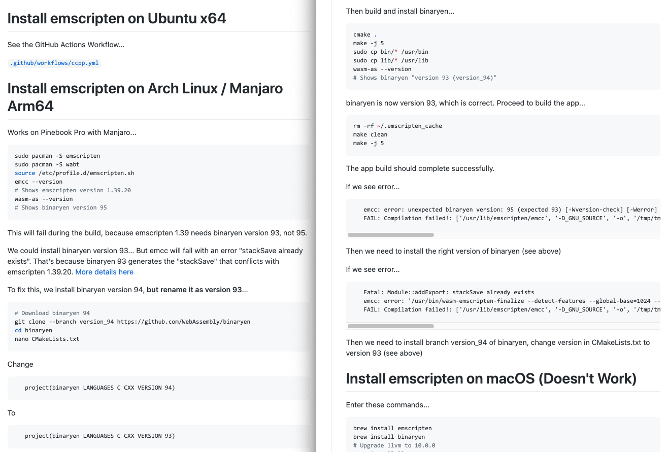 Install #emscripten to compile C and C++ to #WebAssembly... Looks odd but this works on #Pinebook Pro @PINE64 ! https://github.com/AppKaki/lvgl-wasm#install-emscripten-on-arch-linux--manjaro-arm64