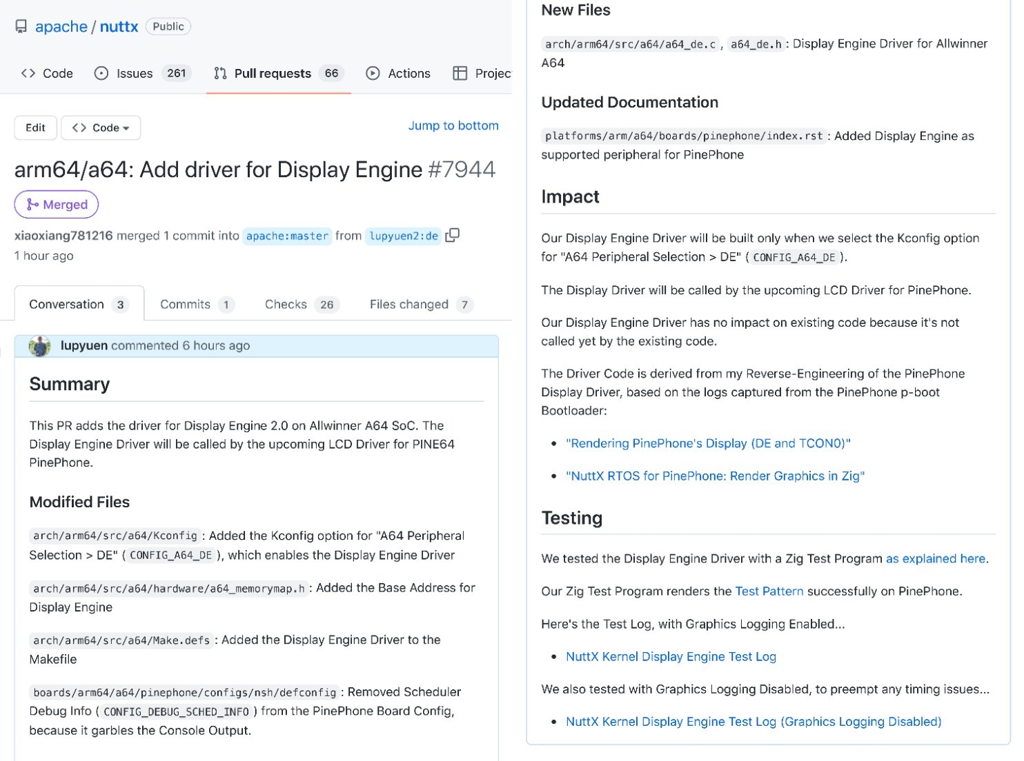 Apache #NuttX Kernel now supports #PinePhone's A64 Display Engine! 🎉 ... Up Next: NuttX Driver for A64 Reduced Serial Bus (which controls PinePhone's Power Mgmt IC)