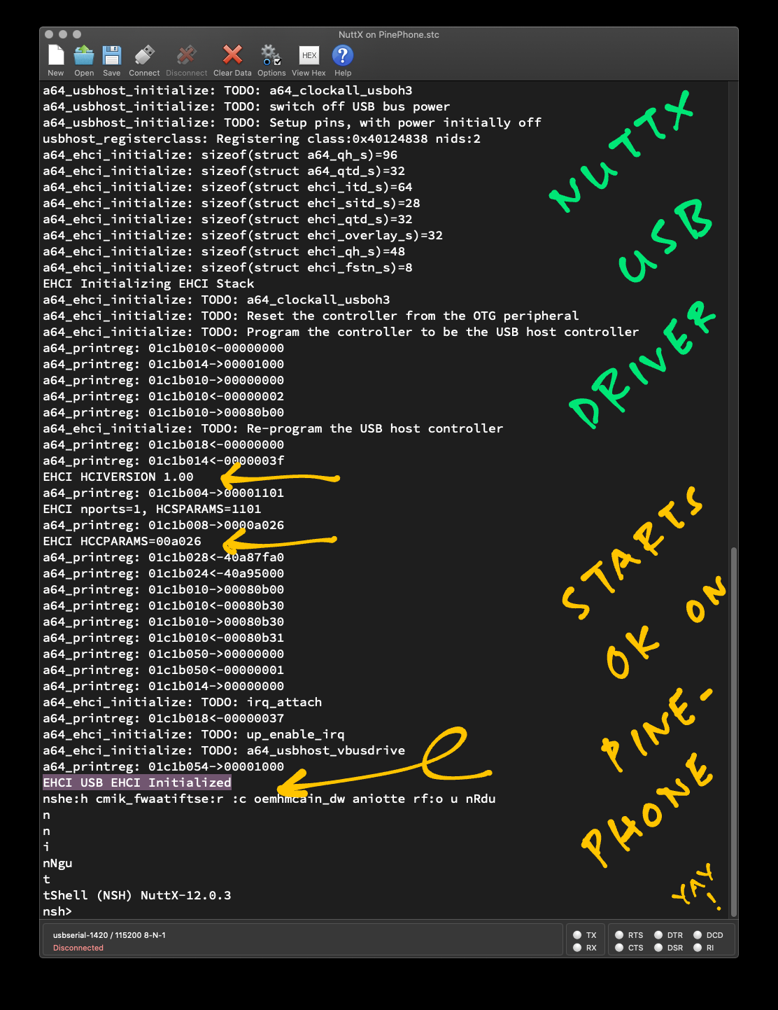 Apache #NuttX USB Driver starts OK on #PinePhone yay! 🎉 Thanks to the super-inspiring coffee with @tllim 😀