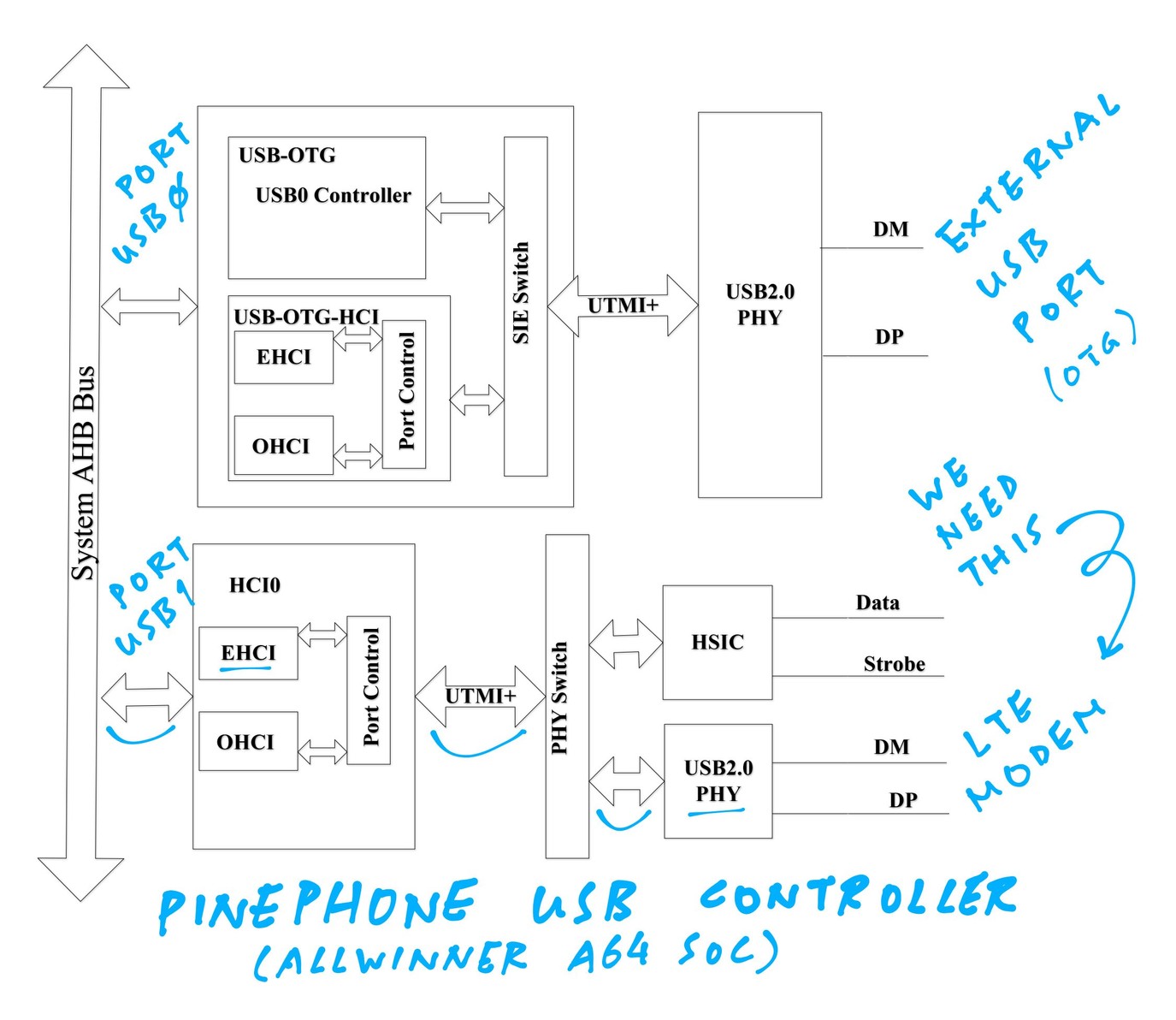 #PinePhone Allwinner A64 has 2 USB Ports ... Both support EHCI, but only one supports OTG