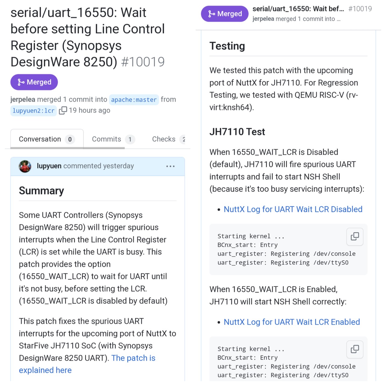 Apache #NuttX RTOS finally boots OK on #RISCV Star64 #JH7110 SBC 🎉 ... Right after we fixed the Spurious (and Furious) UART Interrupts 👍