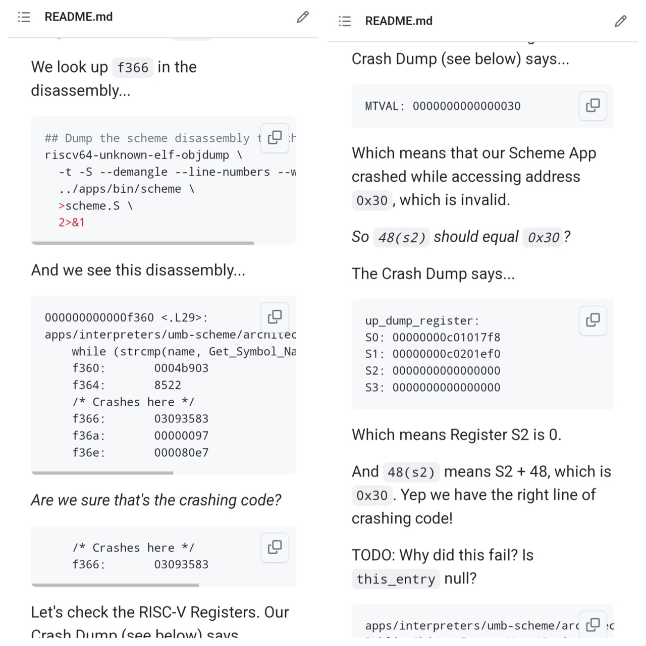 Scheme Lisp crashes on Apache #NuttX RTOS ... Let's look up the #RISCV Disassembly 🧐