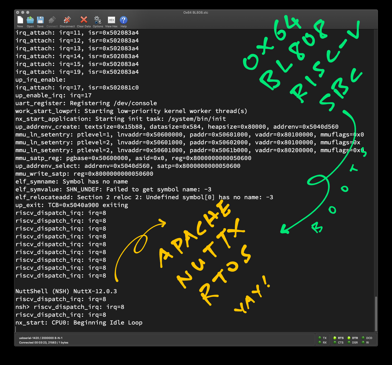 #Ox64 BL808 #RISCV SBC ... Boots Apache #NuttX RTOS yay! 🎉 ... Now fixing Console Input and Interrupts 🤔