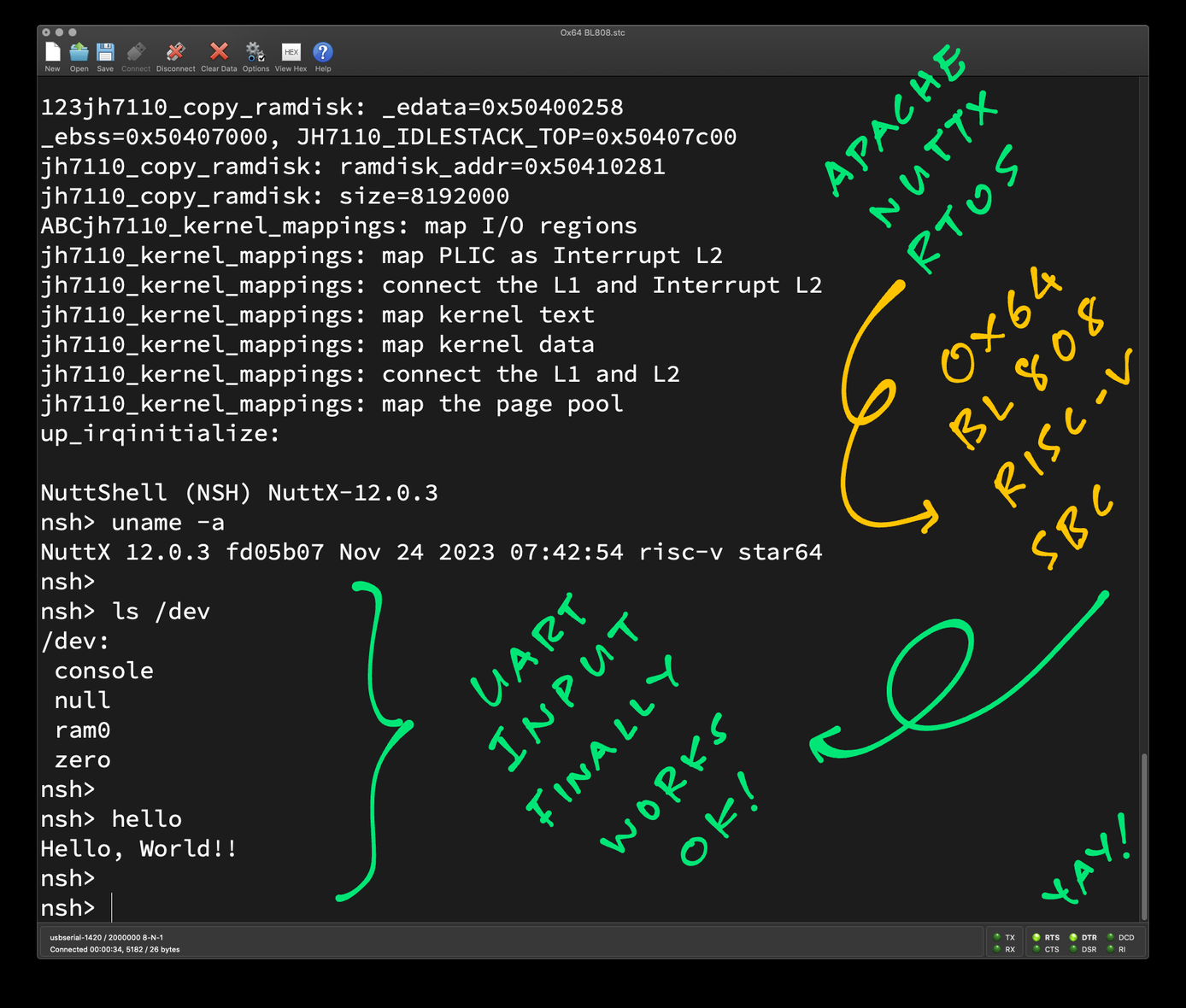 UART Input finally works OK for Apache #NuttX RTOS on #Ox64 BL808 SBC! 🎉