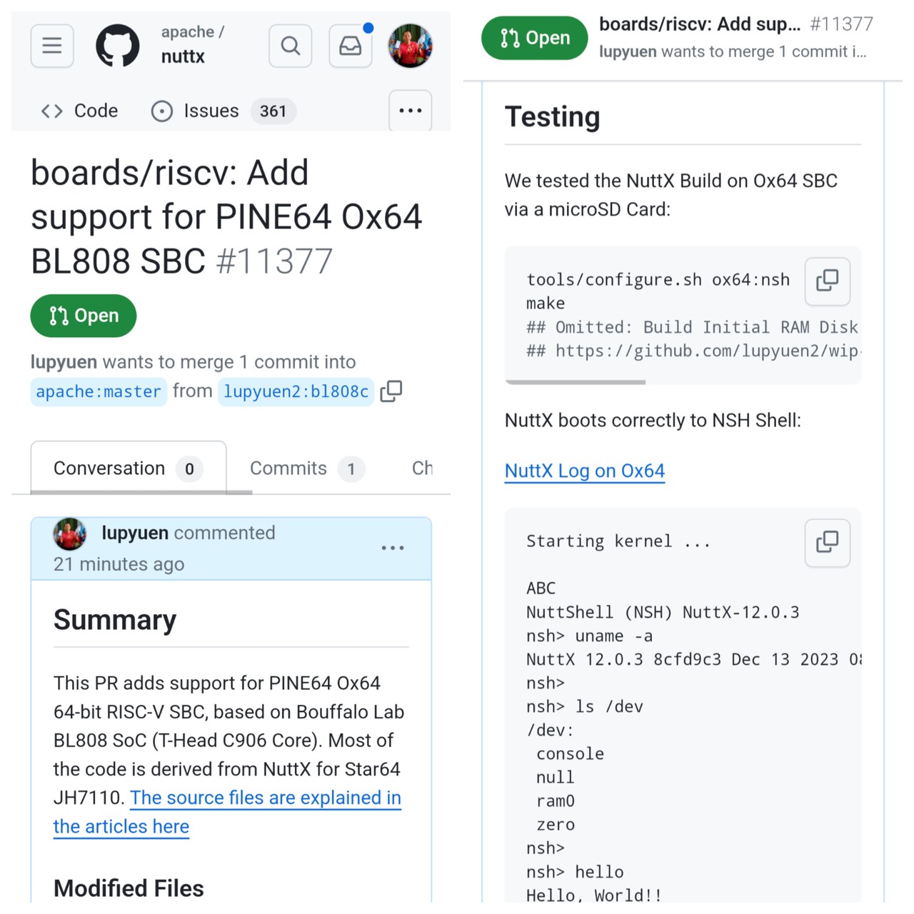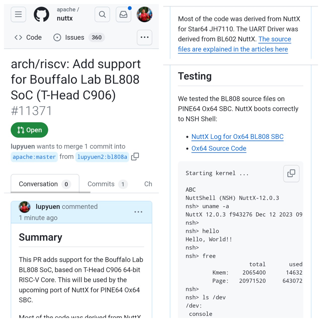 Apache #NuttX RTOS finally boots OK on #Ox64 BL808 #RISCV SBC ... Serial Console works great too! 🎉