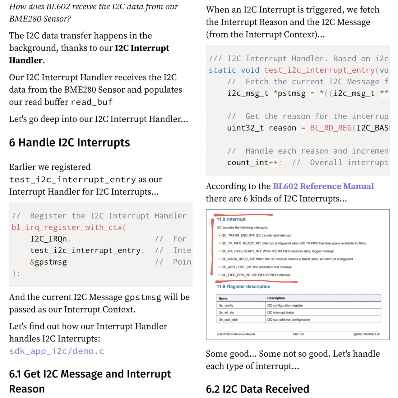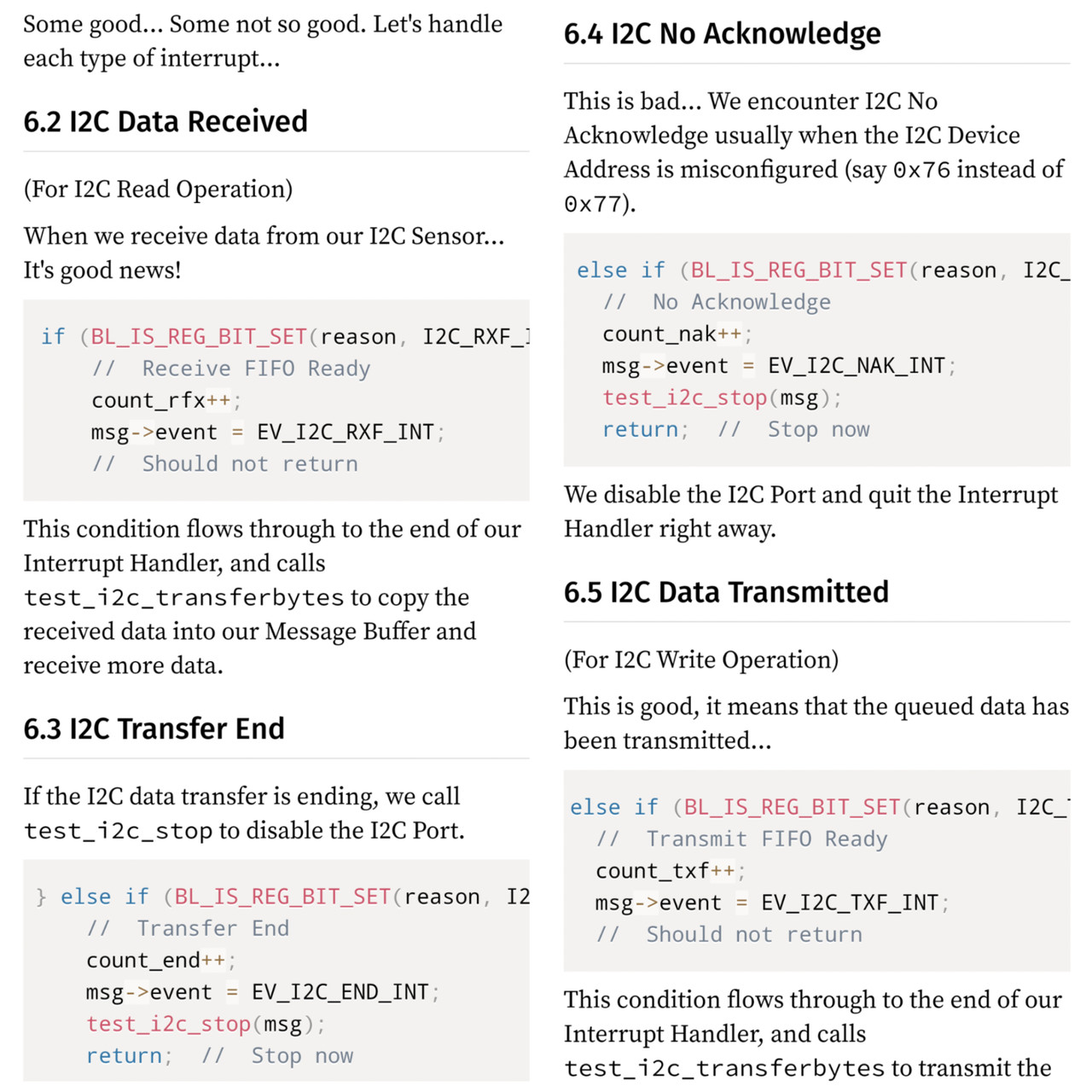 Here's our simple I2C Interrupt Handler ... When we hit an I2C Interrupt, bump up the Interrupt Counters ... Remember: No funny business allowed in Interrupt Handlers (like Console Output)