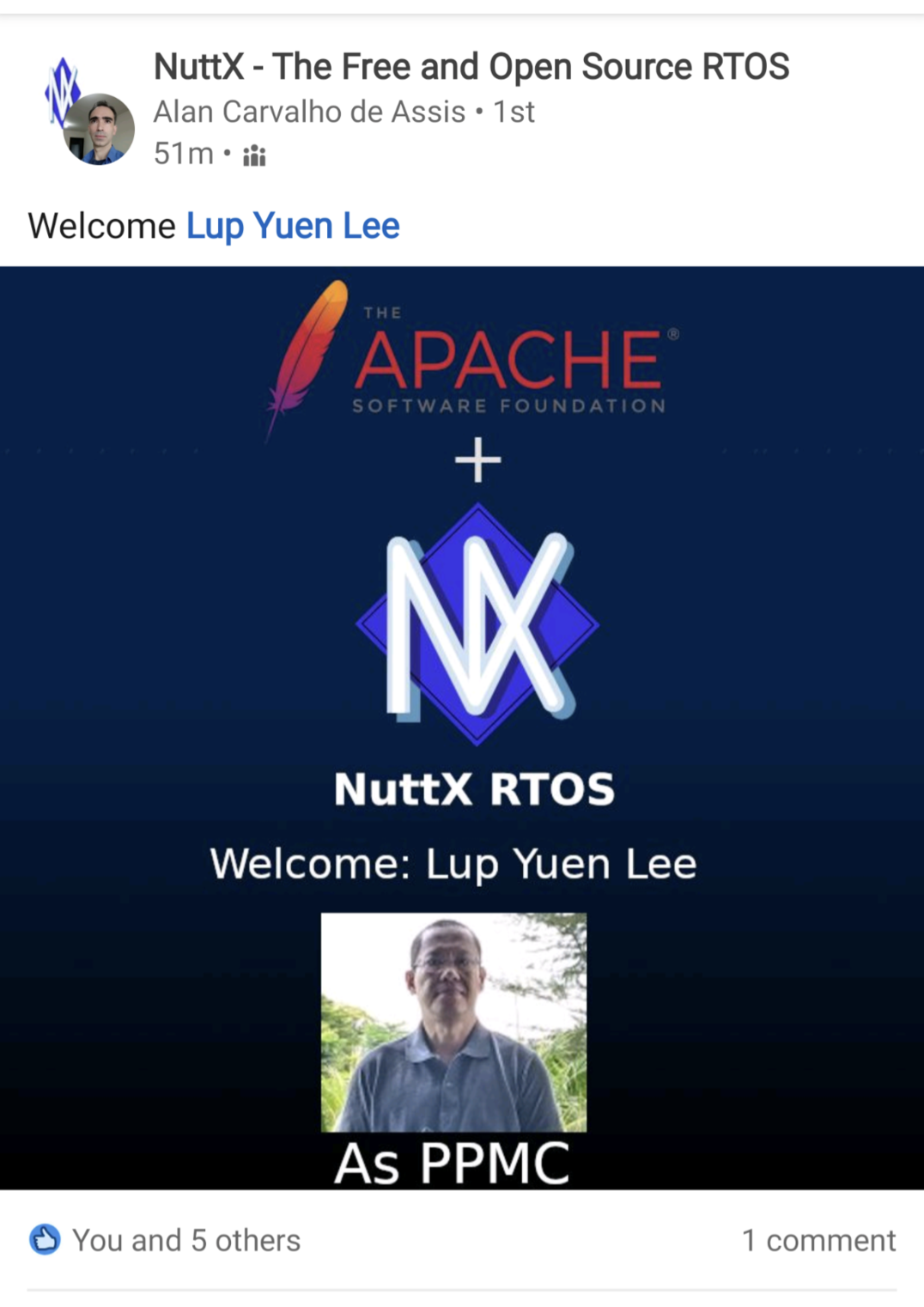 I'm super honoured to join Apache #NuttX PPMC! Let's make NuttX more educational and teachable! 😀