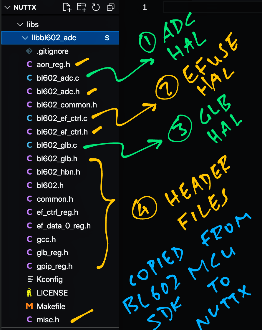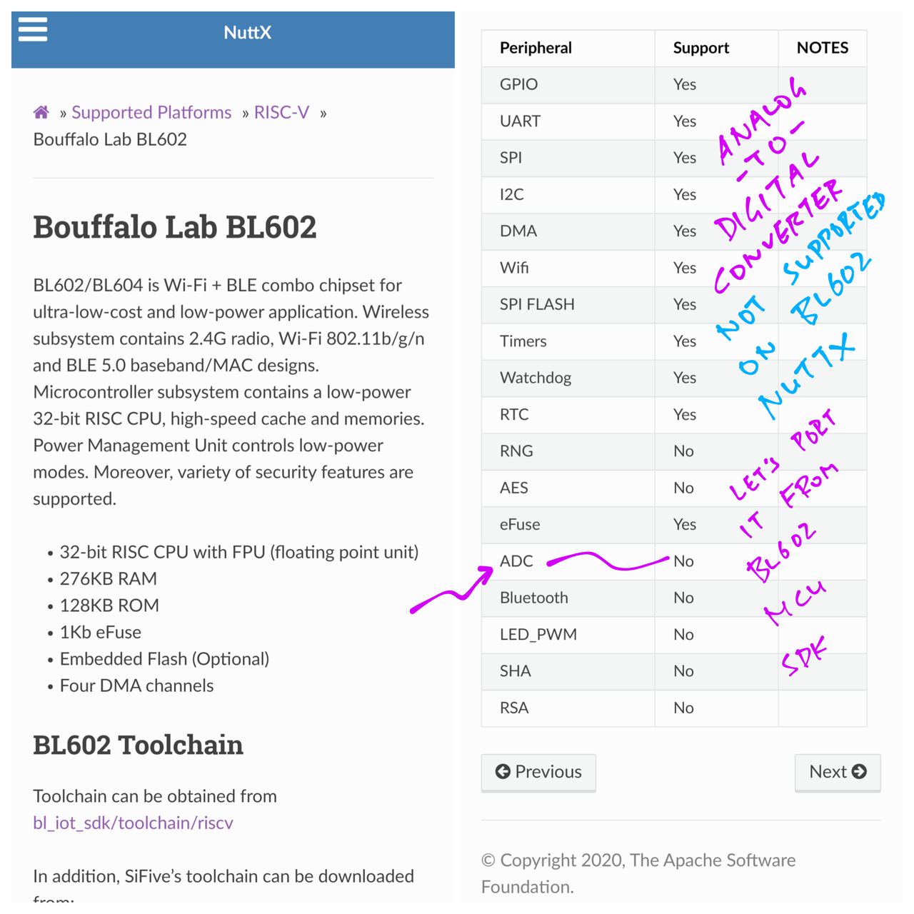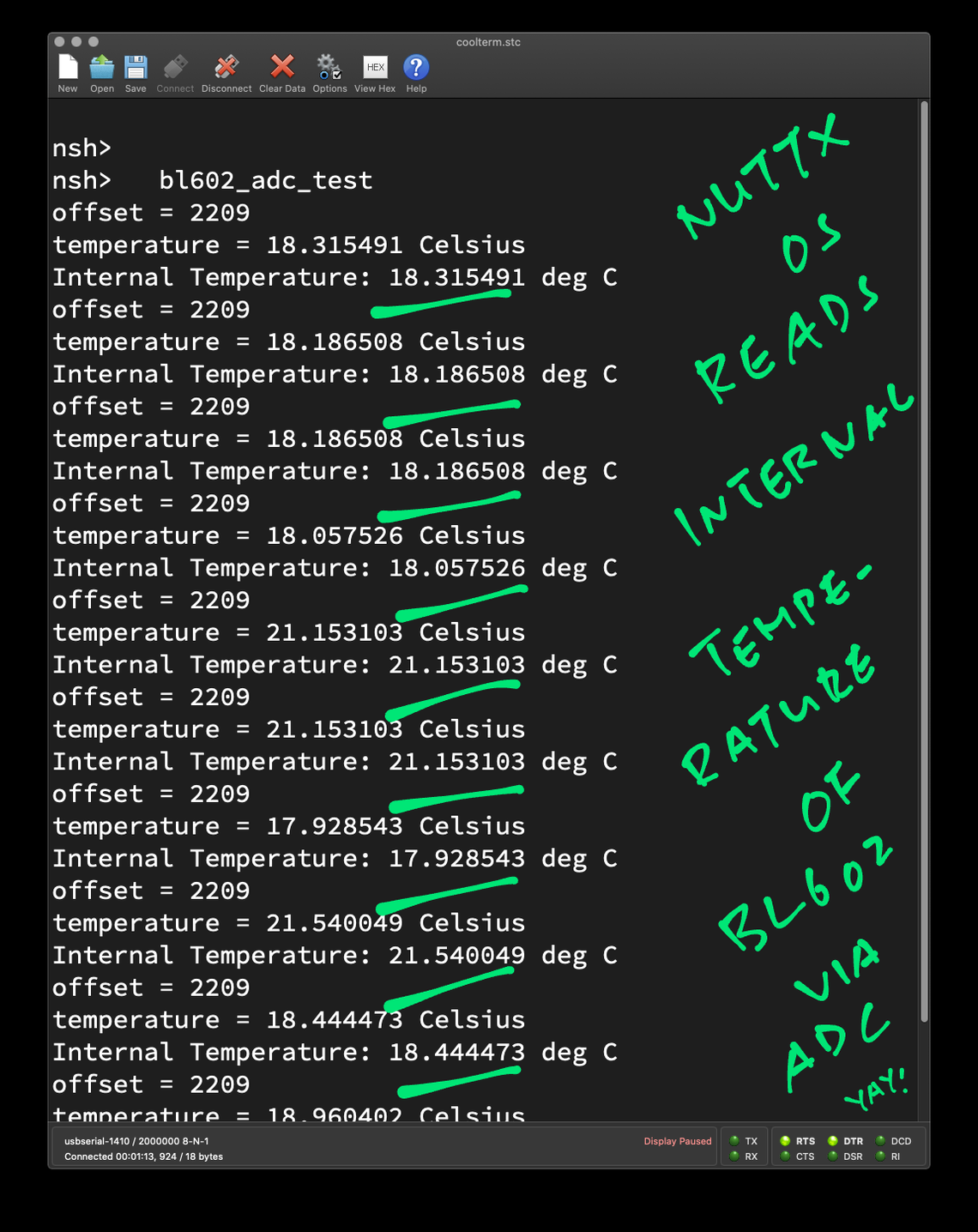 #BL602's Internal Temperature Sensor is connected to the Analog-to-Digital Converter ... Which is NOT yet supported on #NuttX OS ... Let's port the ADC HAL from BL602 MCU SDK
