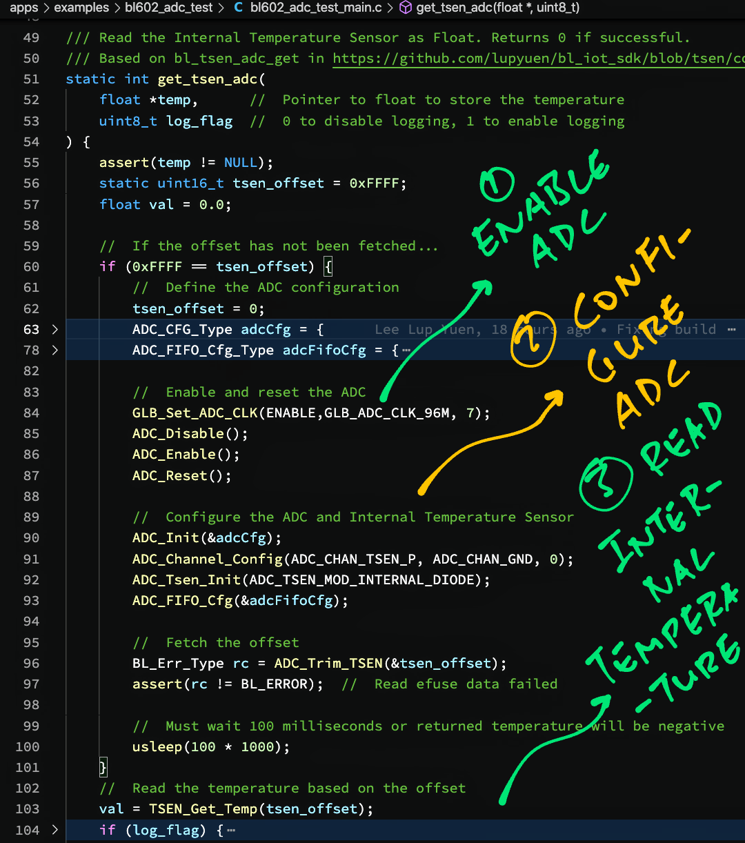 To read #BL602's Internal Temperature on #NuttX OS, we call the ADC HAL like so