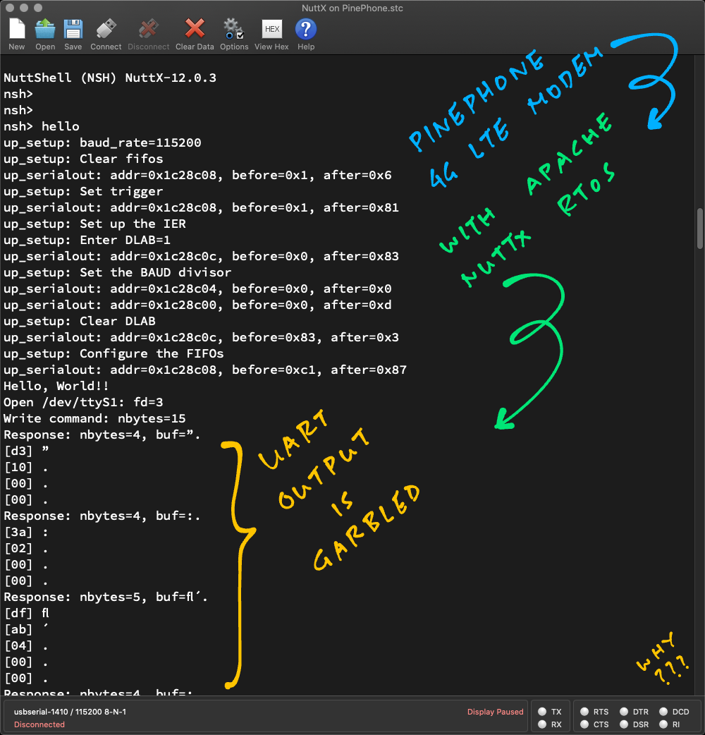 #PinePhone's 4G LTE Modem outputs a garbled stream of data to Apache #NuttX RTOS over UART ... Why? 🤔