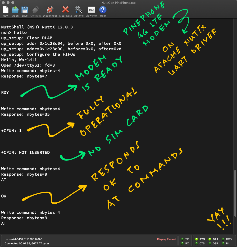 #PinePhone's 4G LTE Modem works OK over UART on Apache #NuttX RTOS! 🎉 ... Just realised that the Reset and Power Key pins were High-Low Inverted 🙄