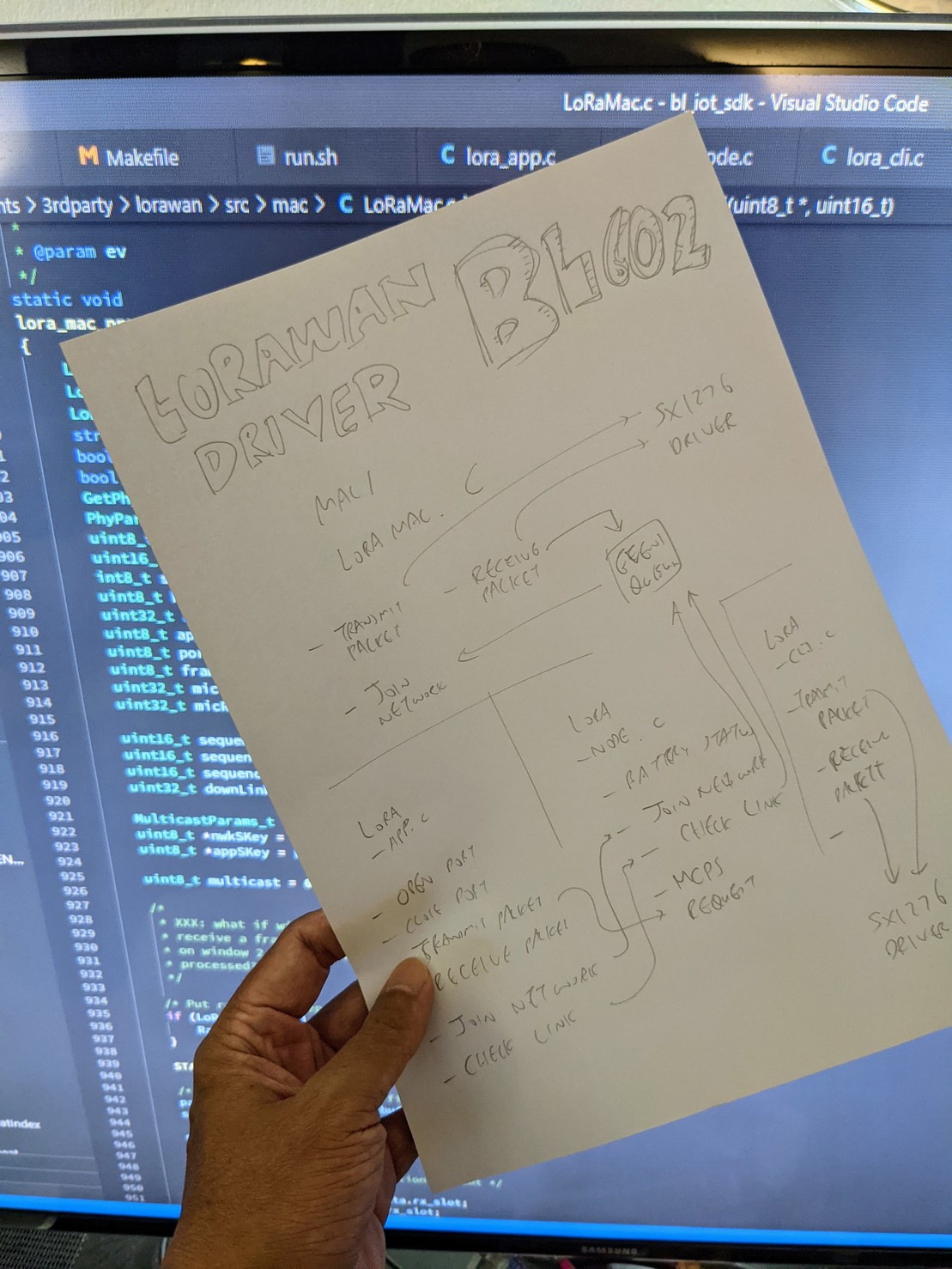 The Node Layer (centre) in our Driver handles the networking operations for our BL602 LoRaWAN Node ... It's called by the Application Layer (left)