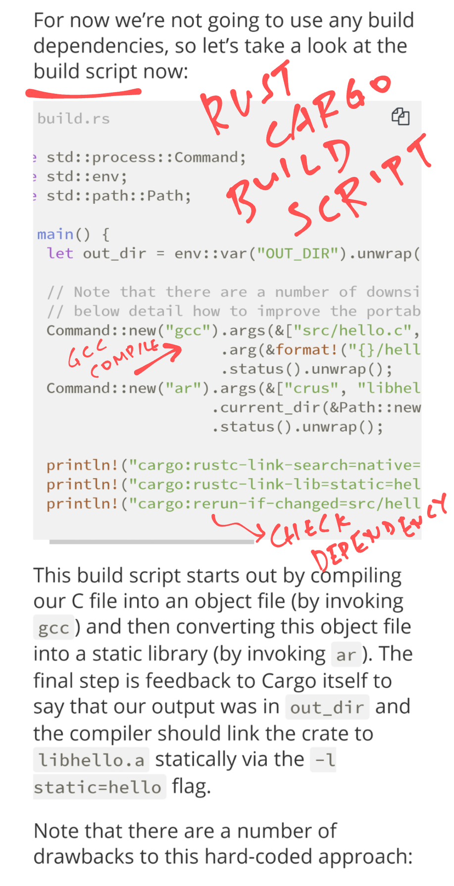 #RustLang "cargo" Build Script can call GCC to compile C code ... Maybe we use this instead of "make" to build #BL602 IoT SDK on Windows? 🤔