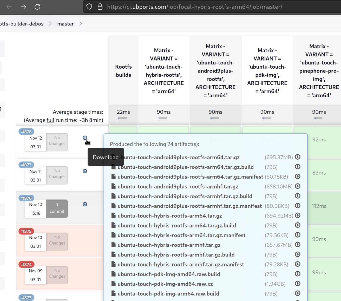 You don't have to do that. If you follow the CI builds link, you will (after one more hop) land on https://ci.ubports.com/job/focal-hybris-rootfs-arm64/job/master/.