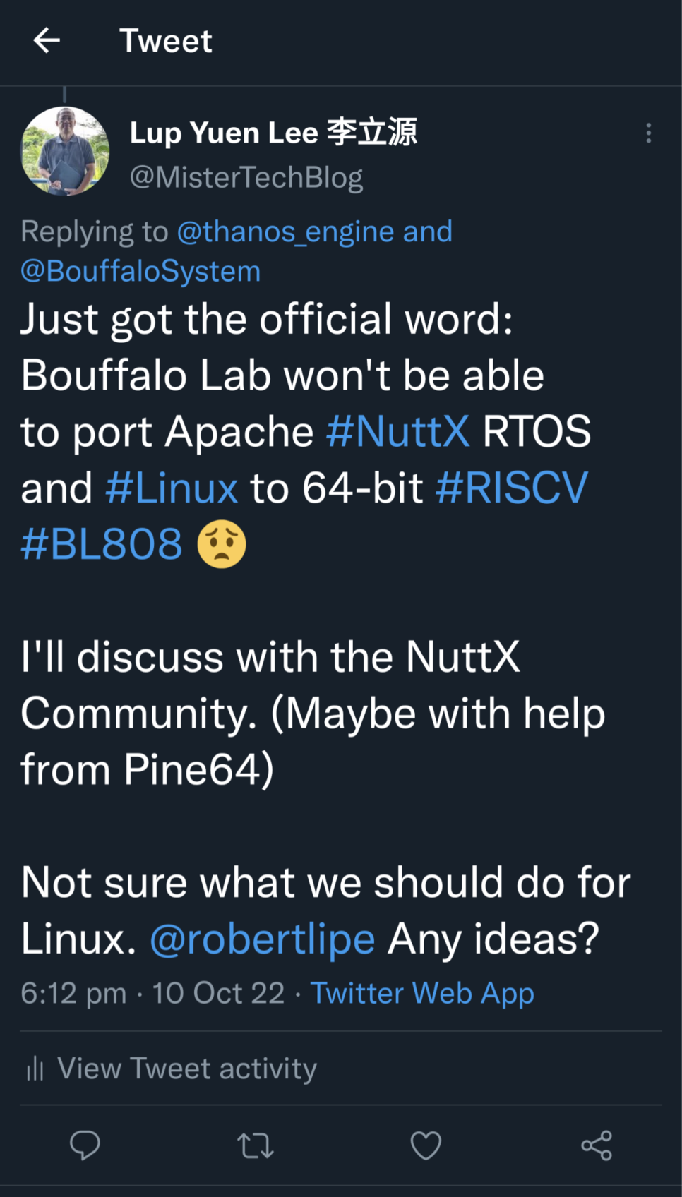 Bouffalo Lab's 64-bit #RISCV BL808 won't support Apache #NuttX RTOS and #Linux at launch 🤔