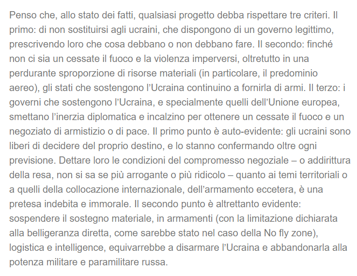 Su "Il Foglio" del 13 aprile Sofri riassume perfettamente in tre punti il nostro piano ipocrita per l'Ucraina: 1) Armare l'esercito ucraino. 2) Armare INCONDIZIONATAMENTE l'esercito ucraino, lasciandolo libero di schierare battaglioni estremisti, civili armati e foreign fighters. 3) I governi chiedano un cessate il fuoco. Chi manca? Tutti noi! Mancano quattro milioni di profughi ucraini in UE, l'intervento civile e umanitario dei popoli europei, il rispetto dei trattati ONU ignorati dalla NATO.