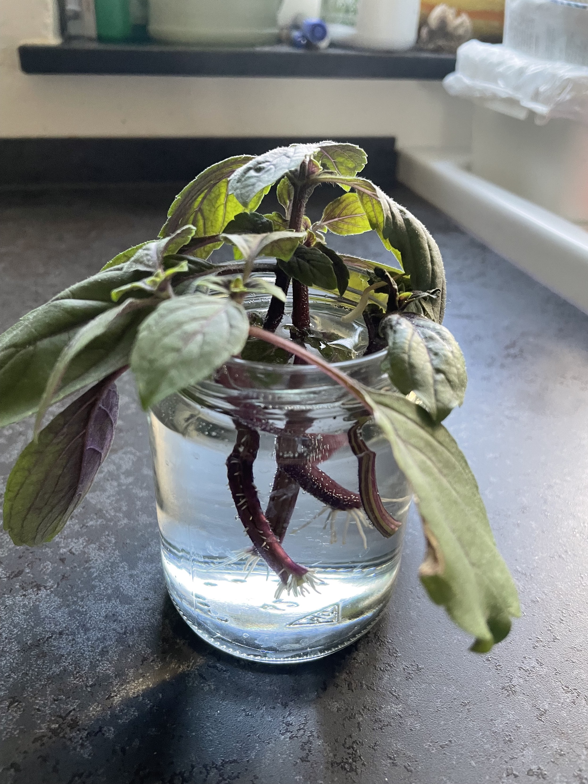 罗勒Magic Blue,买来一盆,剪掉徒长的枝水培。大约十天以后四枝里有三枝生了根。