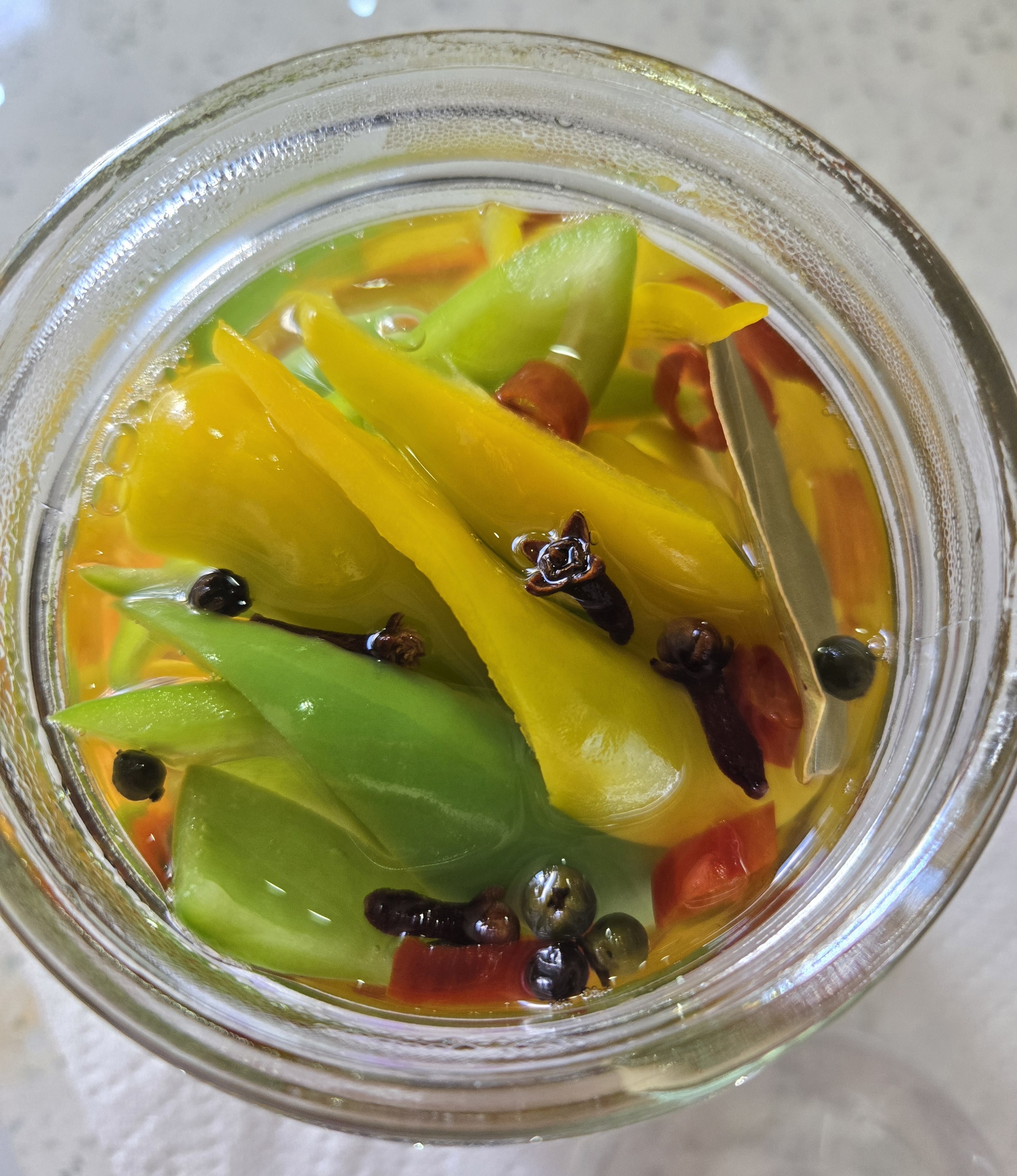 原方子是按1.5L瓶来做的,所以我按他三分之一的量来煮泡菜汁,煮的时候略尝了一下味道还蛮好的,彩椒用了大概100g,泡菜汁液体部分300ml,可以刚好放满一个500ml瓶,但是加了重石之后泡菜汁有溢出,被重石压住的彩椒大概占一半瓶子体积,感觉下次可以把蔬菜加到150~200g再视情况配合重石