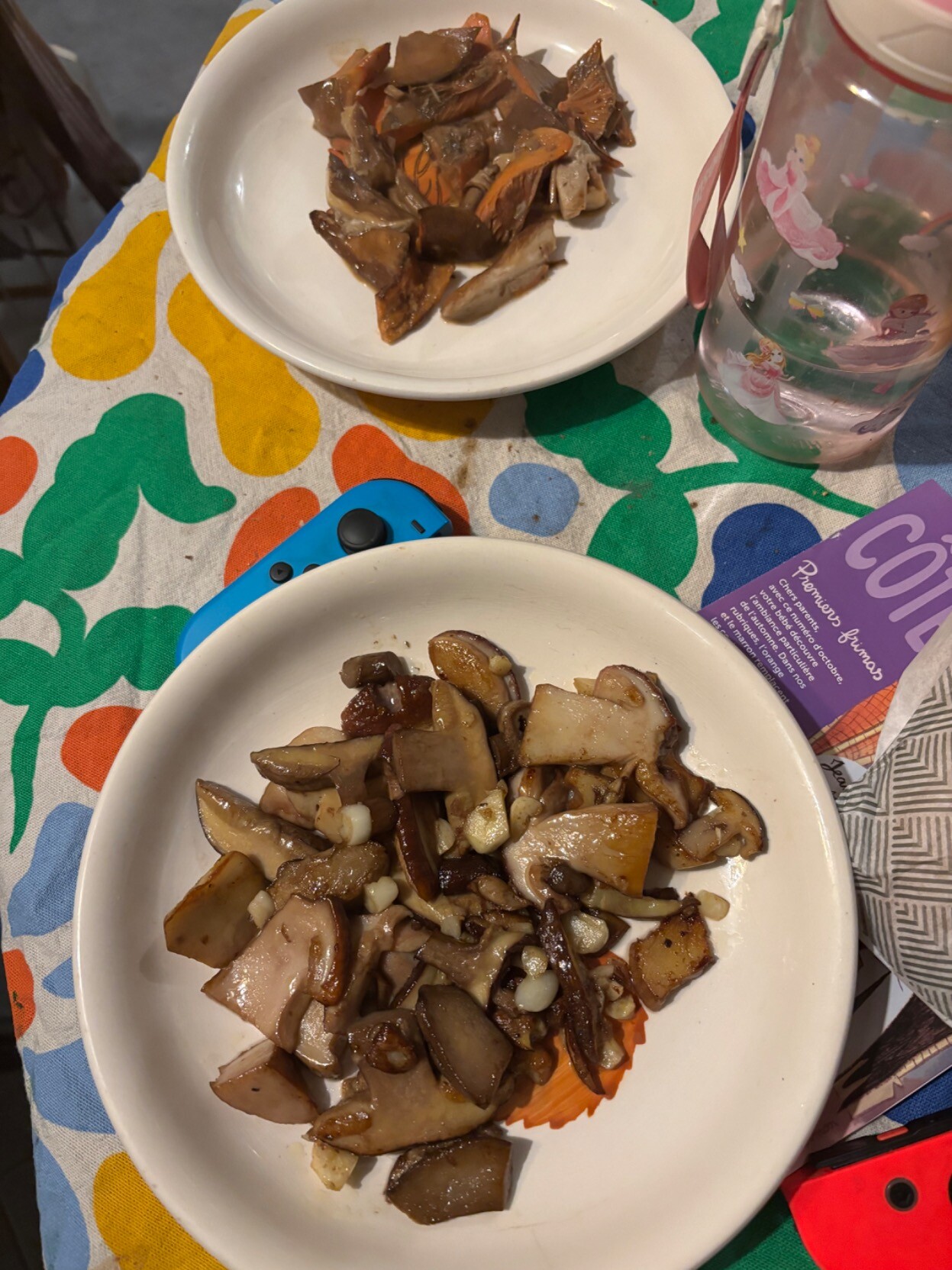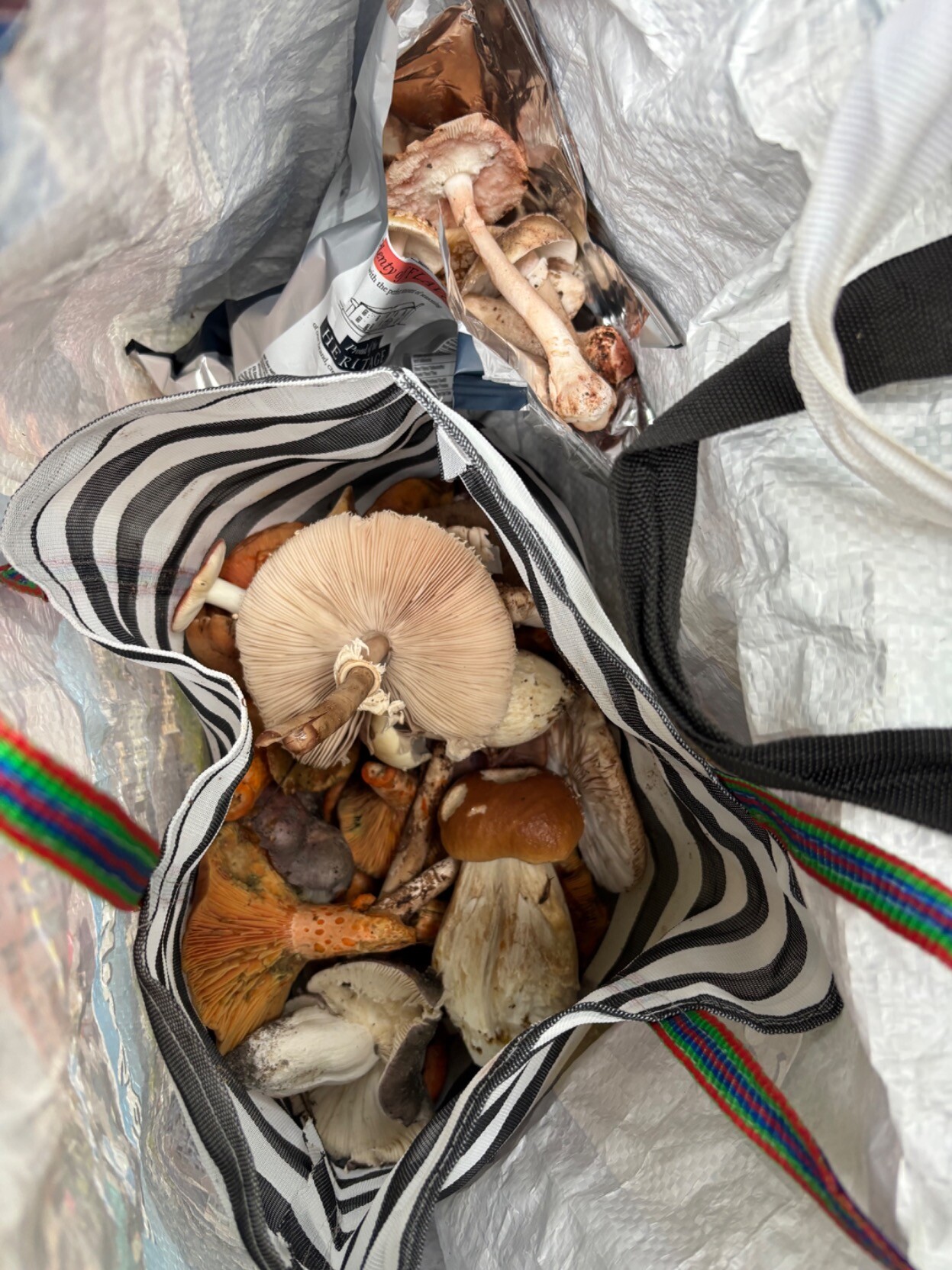 虽然说吃够了但晚饭还是立刻黄油煎了蘑菇,新鲜的好好吃哦!煎了两种牛肝菌(分别是很fancy很难找市场上卖很贵的白牛肝菌和一种普通牛肝菌),另一盘是高大环柄菇和松乳菇。鲜疯我了!台湾朋友说拿回去的牛肝菌一半烘干另一半炒油浸蘑菇酱到时候给我拿一瓶,好期待!!!