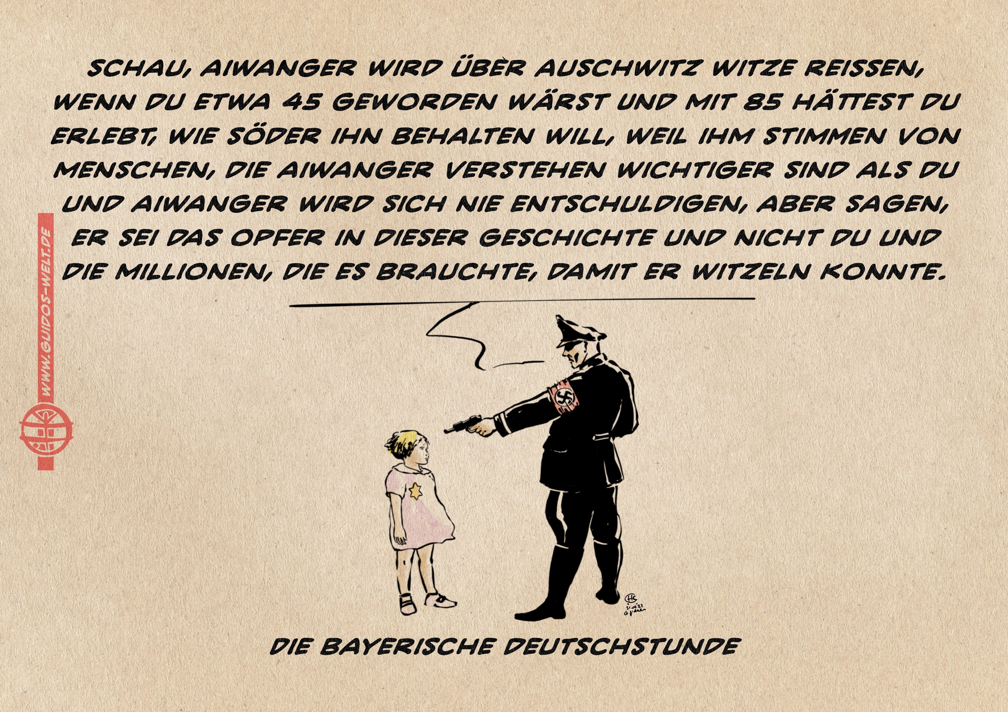 Söder meint die Freien Wähler zu brauchen. Das erlaubt es Aiwanger sich als Opfer zu präsentieren. Was dazu führt, dass die Millionen Gründe vom Säugling bis zu Greisen über die er Witze riss weiter aus kollektivem Bewusstsein und Verantwortung verschwinden. Er bräuchte Haltung.
