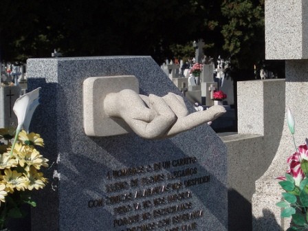 Una peineta para tus allegados. En el cementerio de Ávila podemos toparnos con esta singular lápida que con solo una figura ya lo dice todo. No obstante, el epitafio reza lo siguiente: "A hombros o en un carrito / lleno de flores llegamos. / Con cínicas alabanzas nos despiden / pero ya no nos importa / porque no escuchamos. / Más os decimos con esperanza / que al final de este viaje / os esperamos".