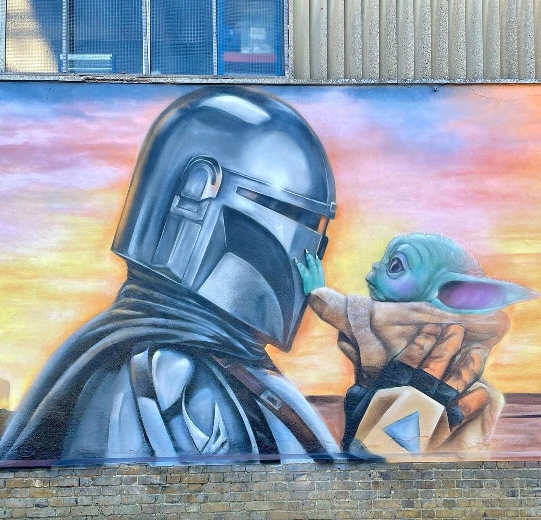 🔵 Artist: #GNASHER / #GnasherMurals in City: #Harlow UK 🇬🇧 - Title: "The Mandalorian and The child" (Detail) - #Streetart #Art #Mastoart #Mural #BabyYoda #StarwarsDay #TheMandalorian